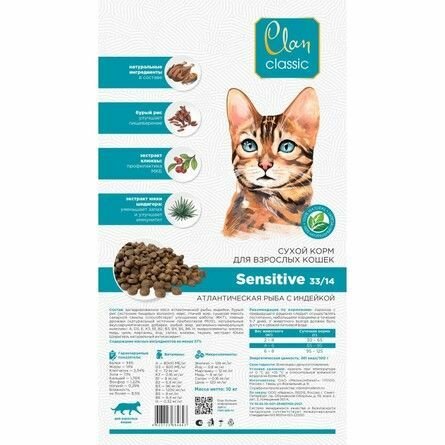 CLAN CLASSIC Sensitive-33/14 корм сухой для кошек чувствительным пищеварением Атлантическая рыба с Индейкой 10кг