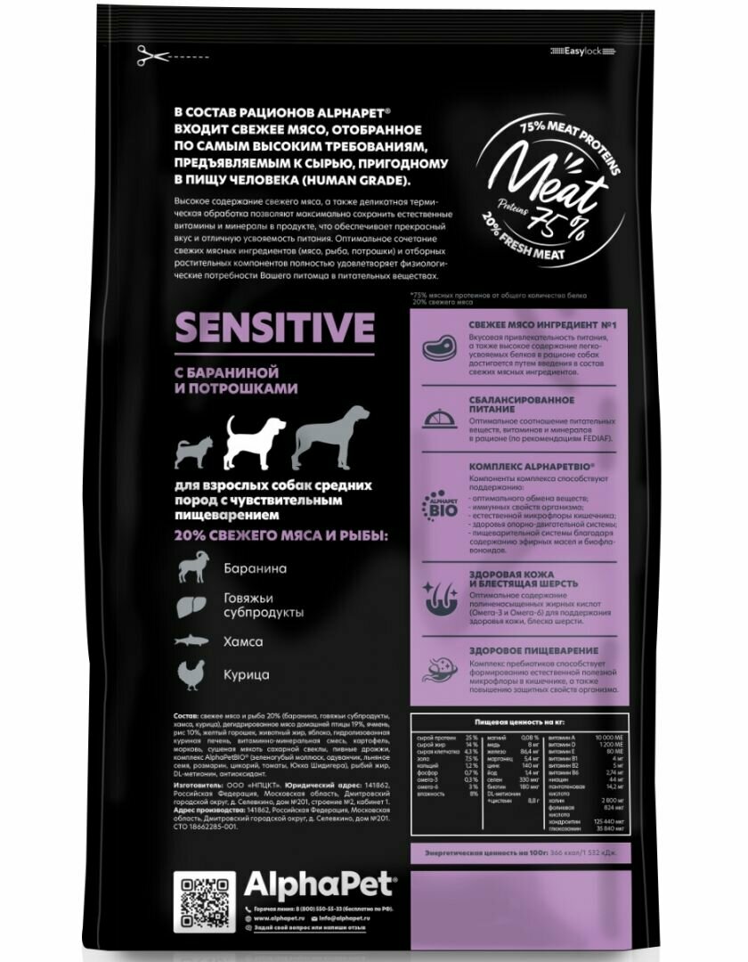 AlphaPet Superpremium Sensitive Medium Сухой корм для собак средних пород с чувствительным пищеварением Баранина и Потрошки 12кг