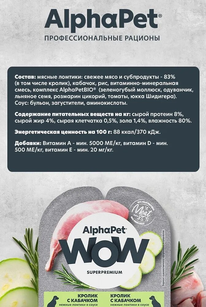 Купить AlphaPet WOW Superpremium влажный корм для взрослых собак нежные ломтики кролика с кабачком в соусе, в ламистерах - 100 г х 15 шт