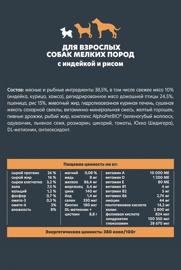 СохранитьAlphaPet WOW Superpremium сухой полнорационный корм для взрослых собак мелких пород с индейкой и рисом - 1,5 кг интересное: