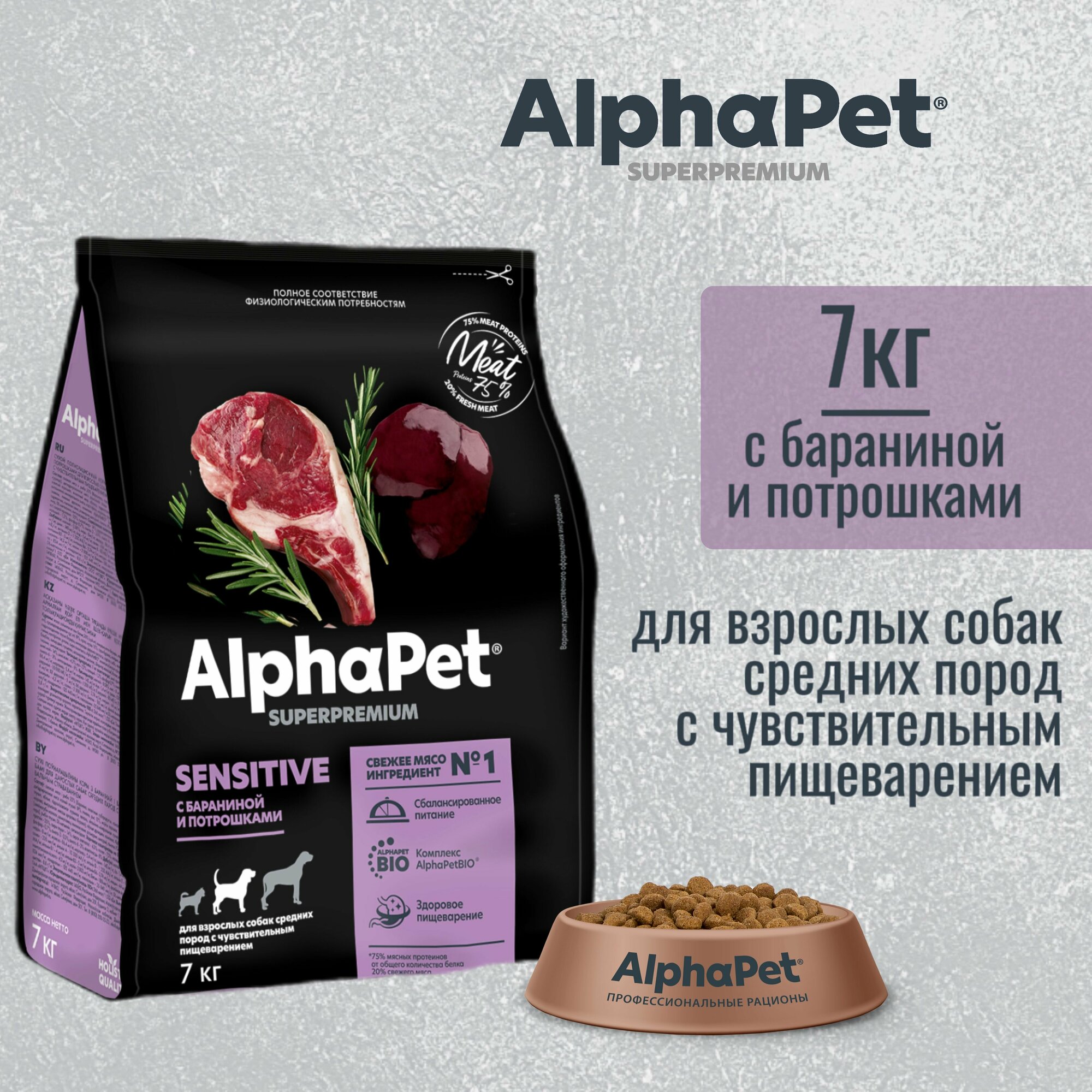 Купить Сухой корм AlphaPet Superpremium для взрослых собак средних пород с чувствительным пищеварением, с бараниной и потрошками, 7 кг