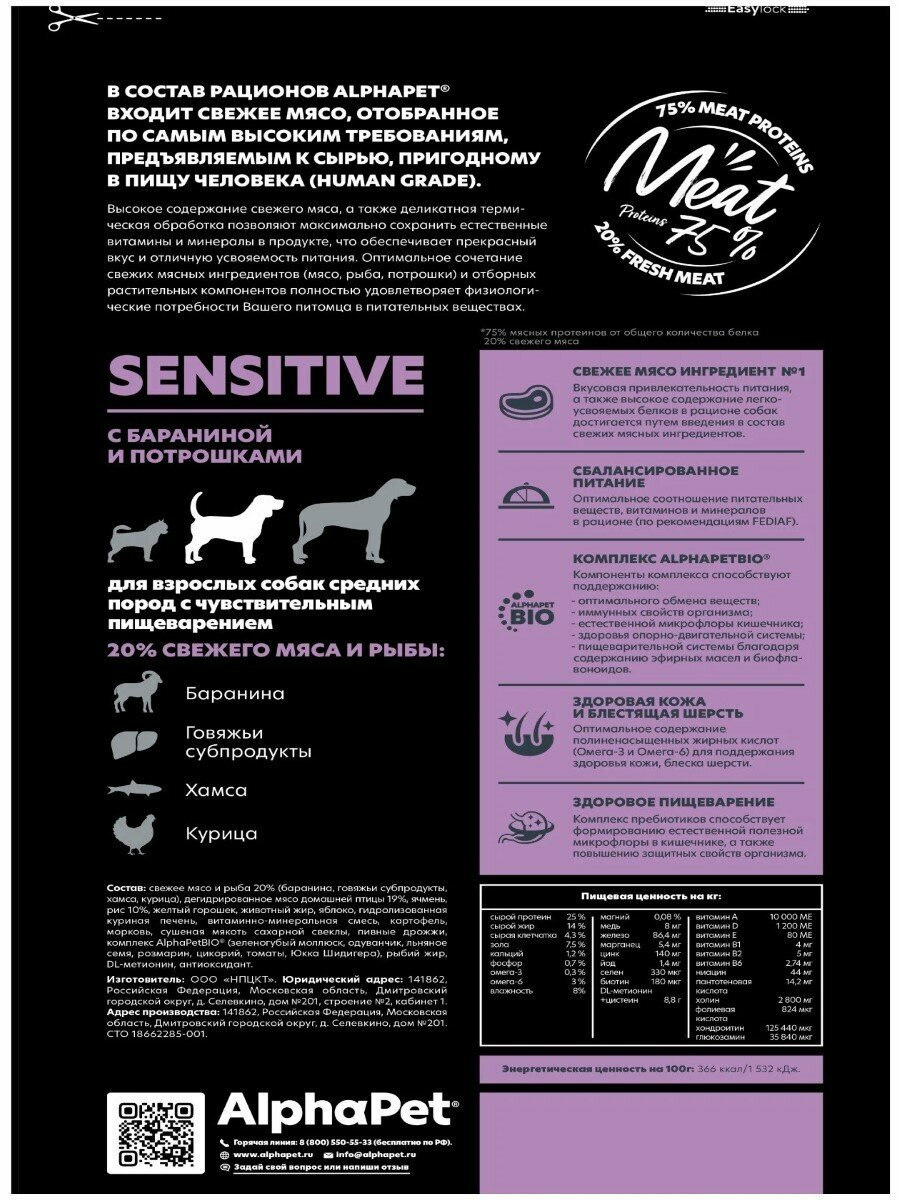 AlphaPet Superpremium Sensitive Medium Сухой корм для собак средних пород с чувствительным пищеварением Баранина и Потрошки 12кг