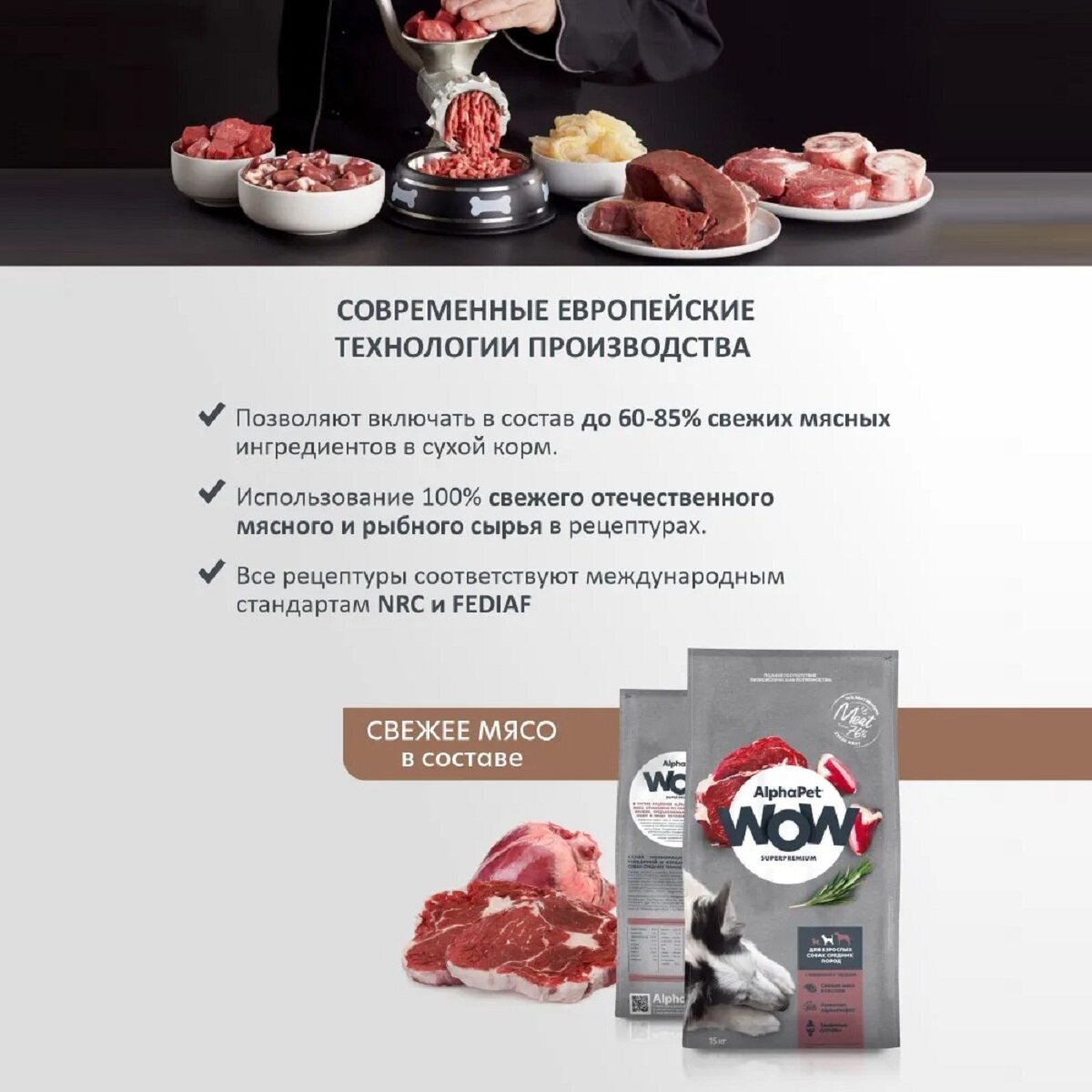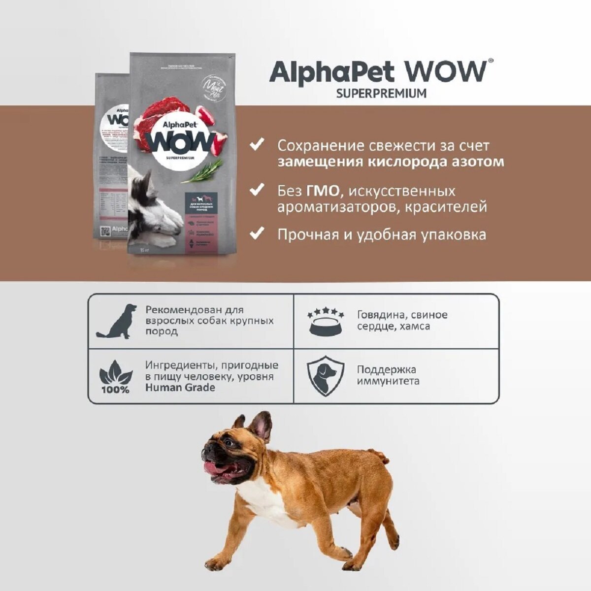 Сухой полнорационный корм с говядиной и сердцем для взрослых собак крупных пород AlphaPet WOW Superpremium 15 кг