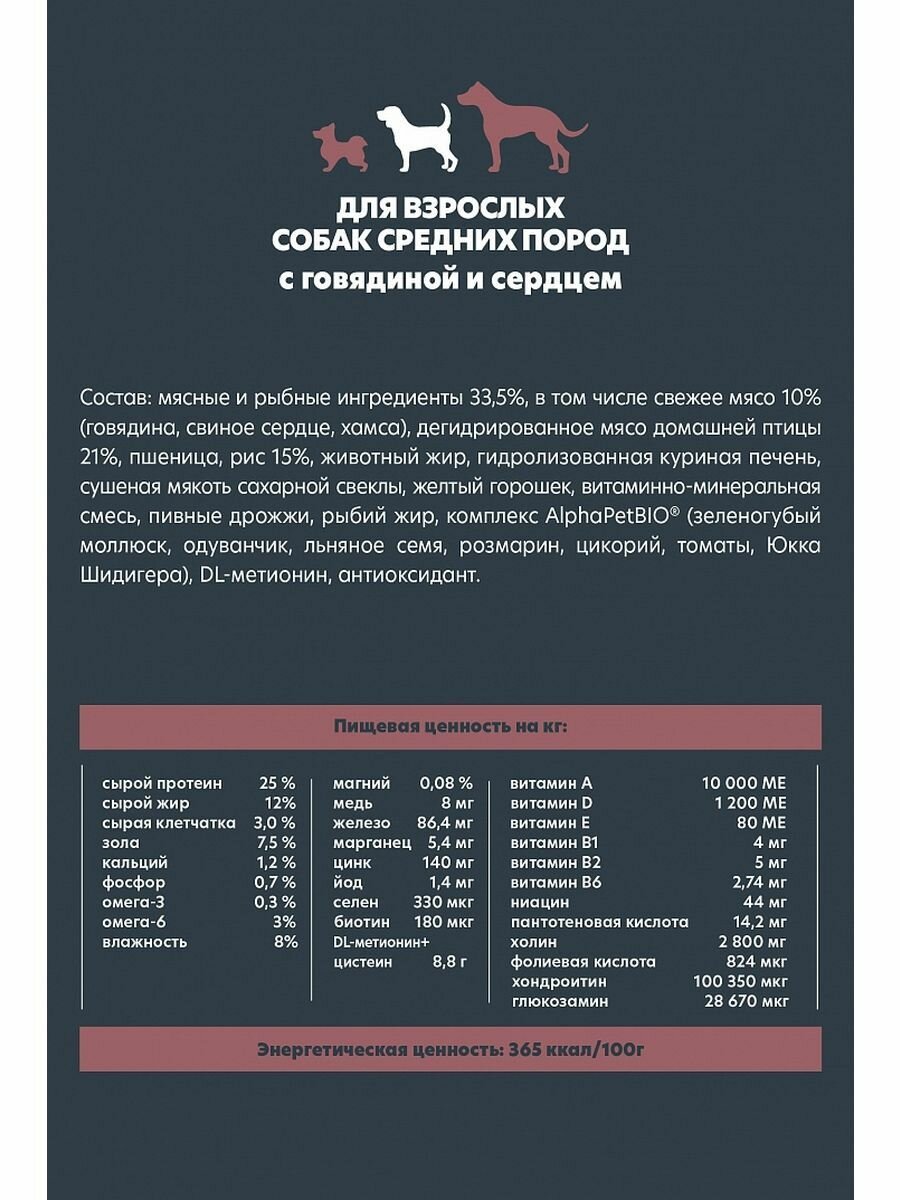 Купить AlphaPet Корм для собак средних пород говядина,сердце 15 кг