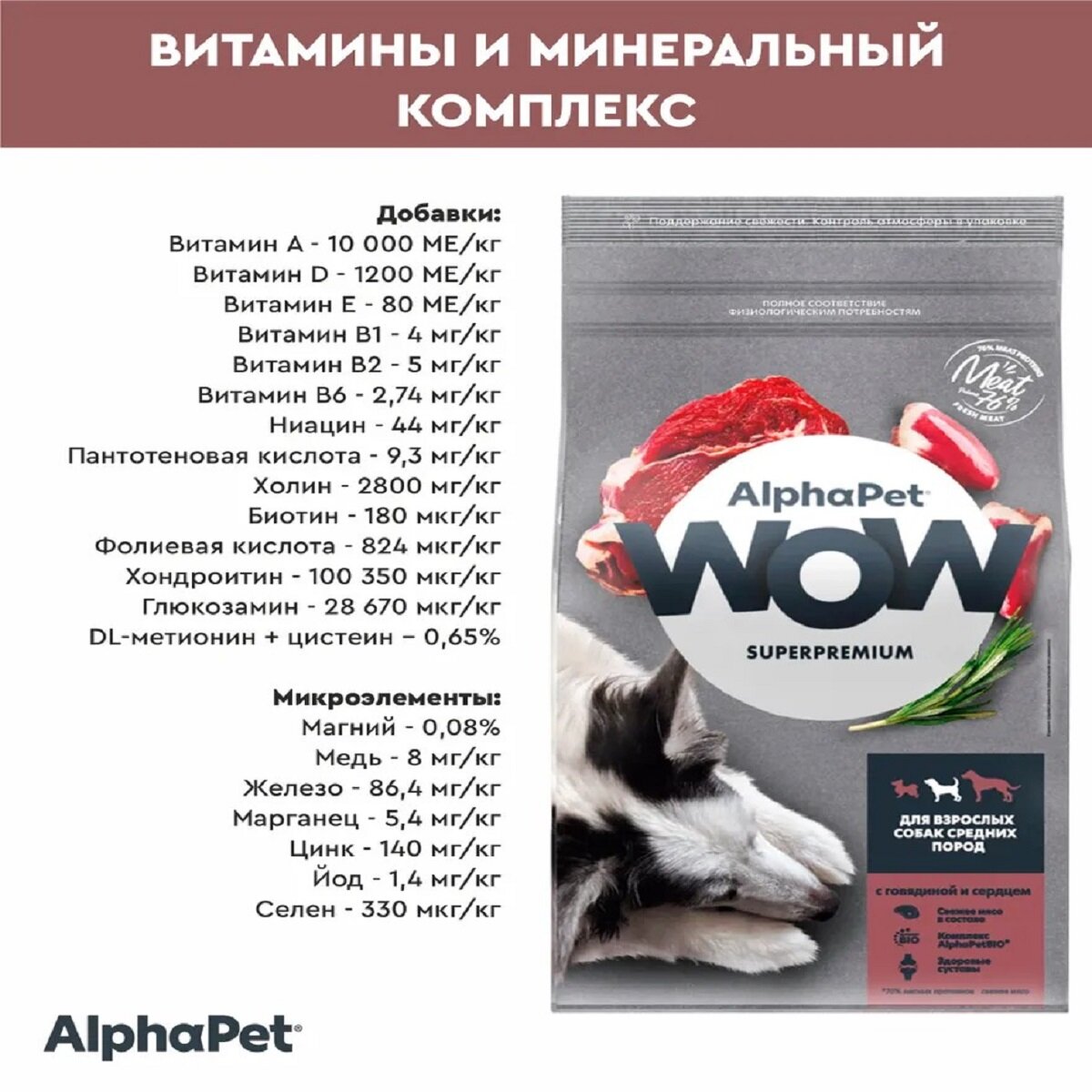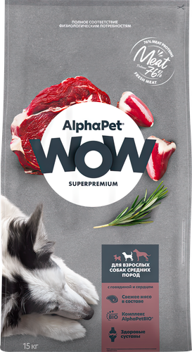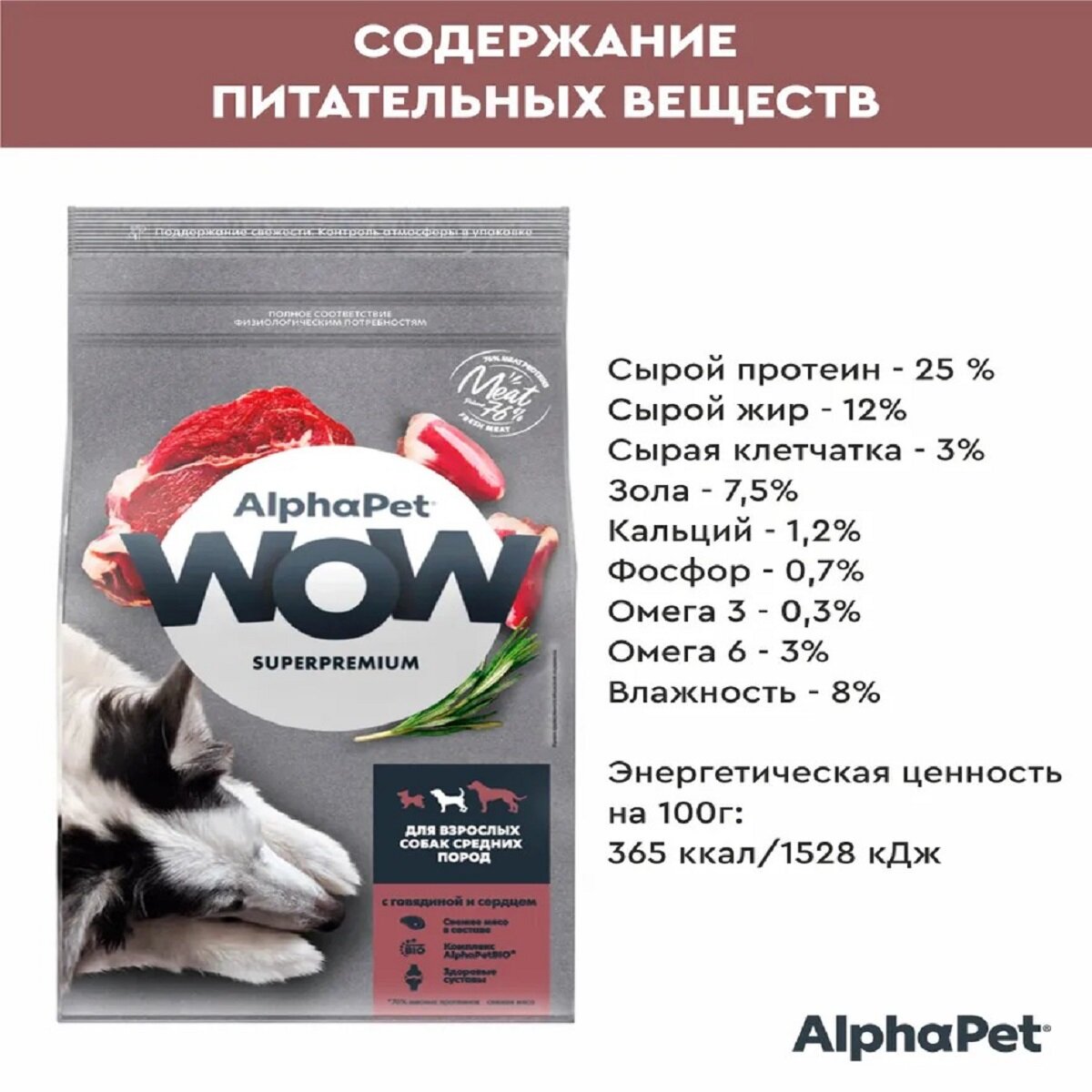 Сухой корм AlphaPet WOW для взрослых собак средних пород с говядиной и сердцем 2 кг