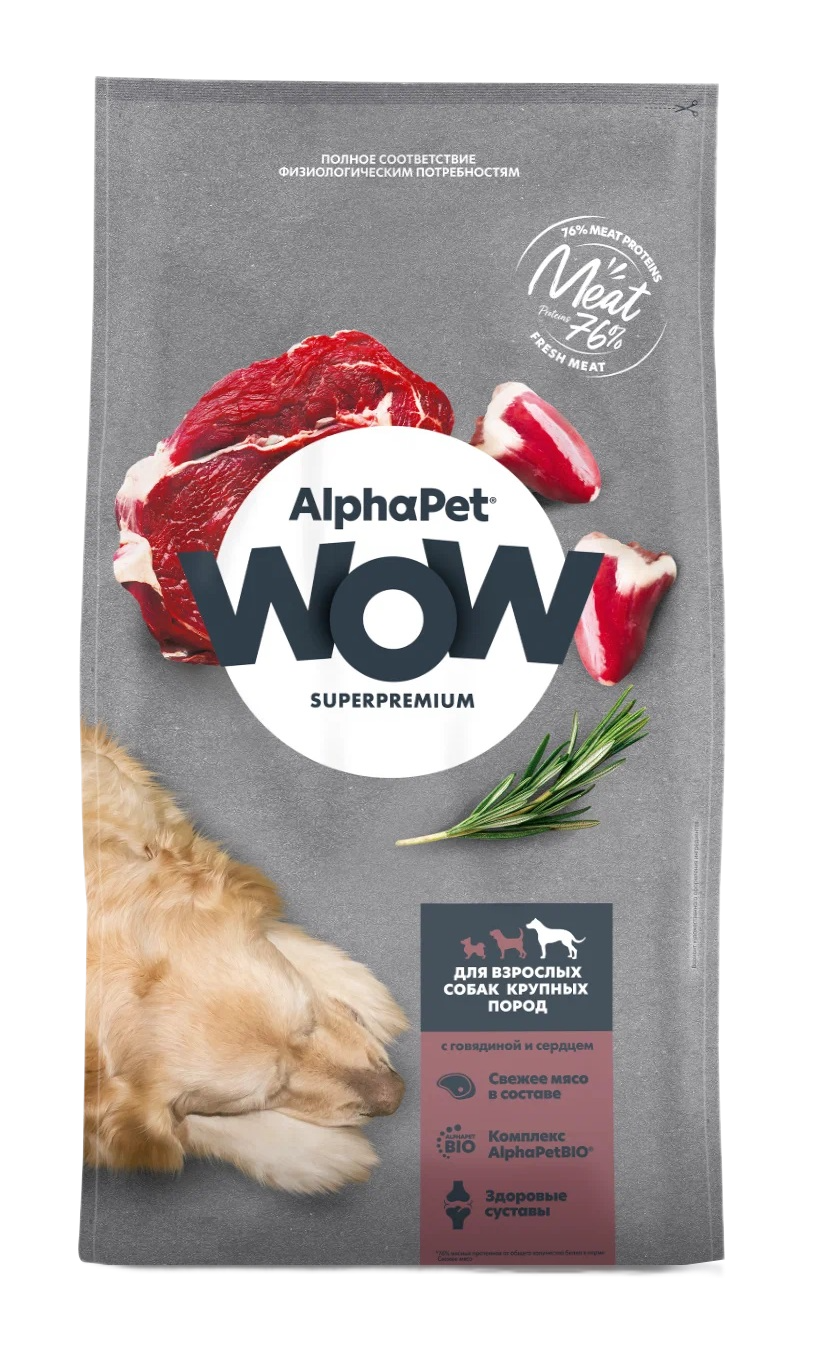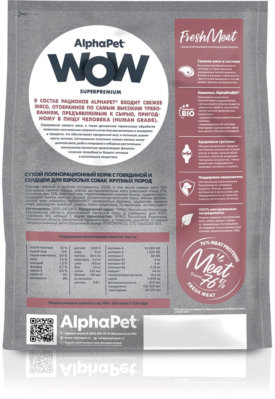 Сухой корм для собак AlphaPet WOW Superpremium, для крупных пород, с говядиной и сердцем, 7кг