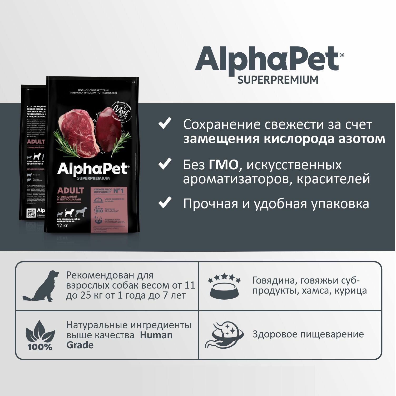 ALPHAPET SUPERPREMIUM ADULT для взрослых собак средних пород с говядиной и потрошками (12 + 12 кг)