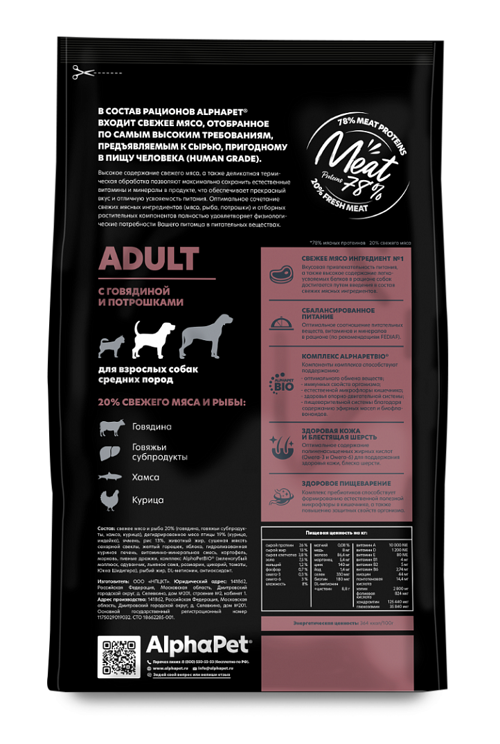 ALPHAPET SUPERPREMIUM ADULT для взрослых собак средних пород с говядиной и потрошками (12 + 12 кг)