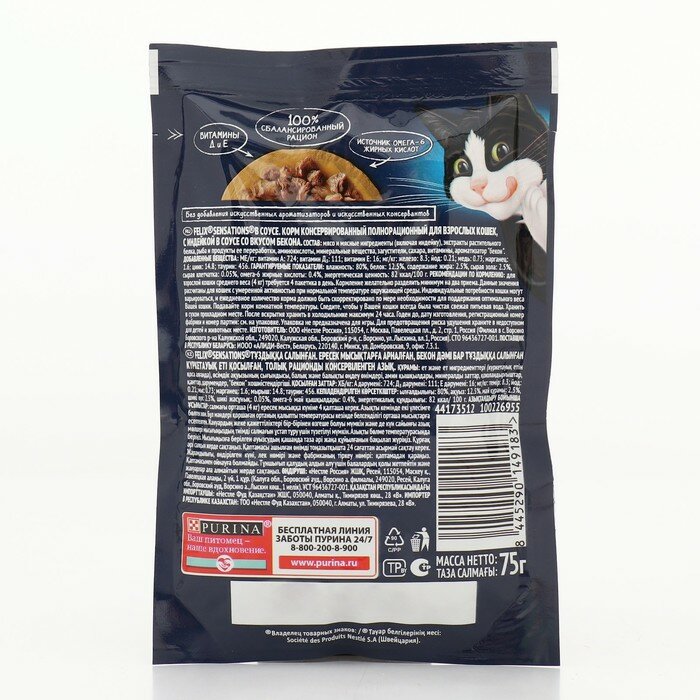 Felix Sensations 75 г пауч влажный корм в удивительном соусе для кошек, индейка с беконом 78 шт