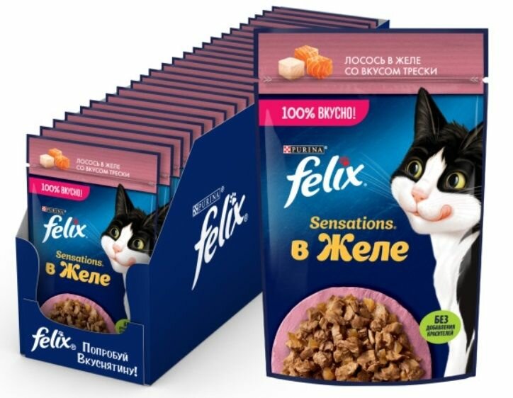 Купить Влажный корм для взрослых кошек Felix Sensations лосось в желе со вкусом трески 26шт.*75г