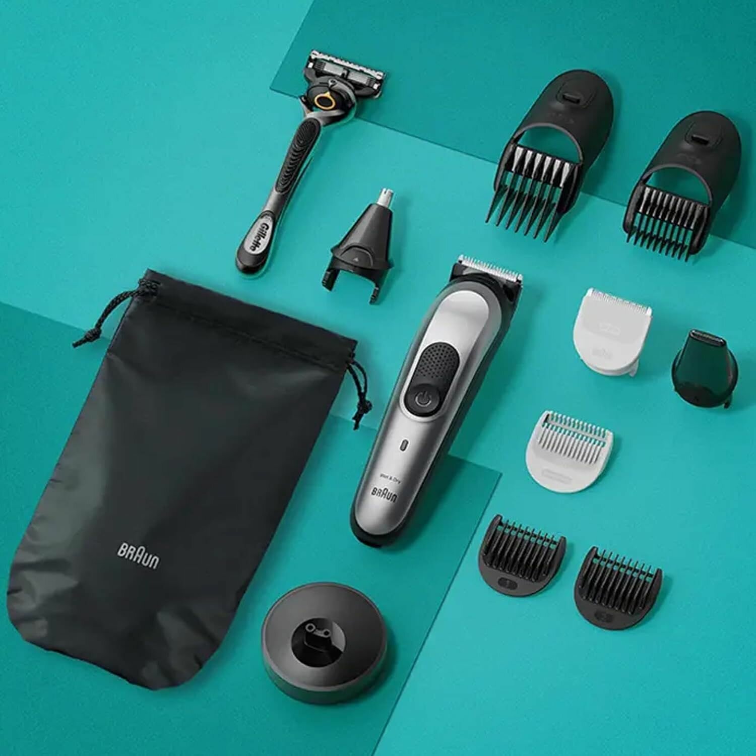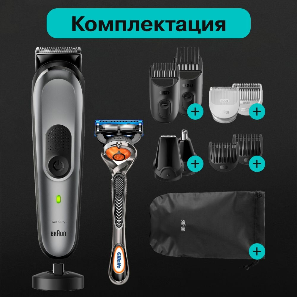 Аккумуляторный триммер для бороды и усов Braun MGK7320 6 в 1 с бритвой Gillette, 4 насадками, 20 настройками длины и чехлом