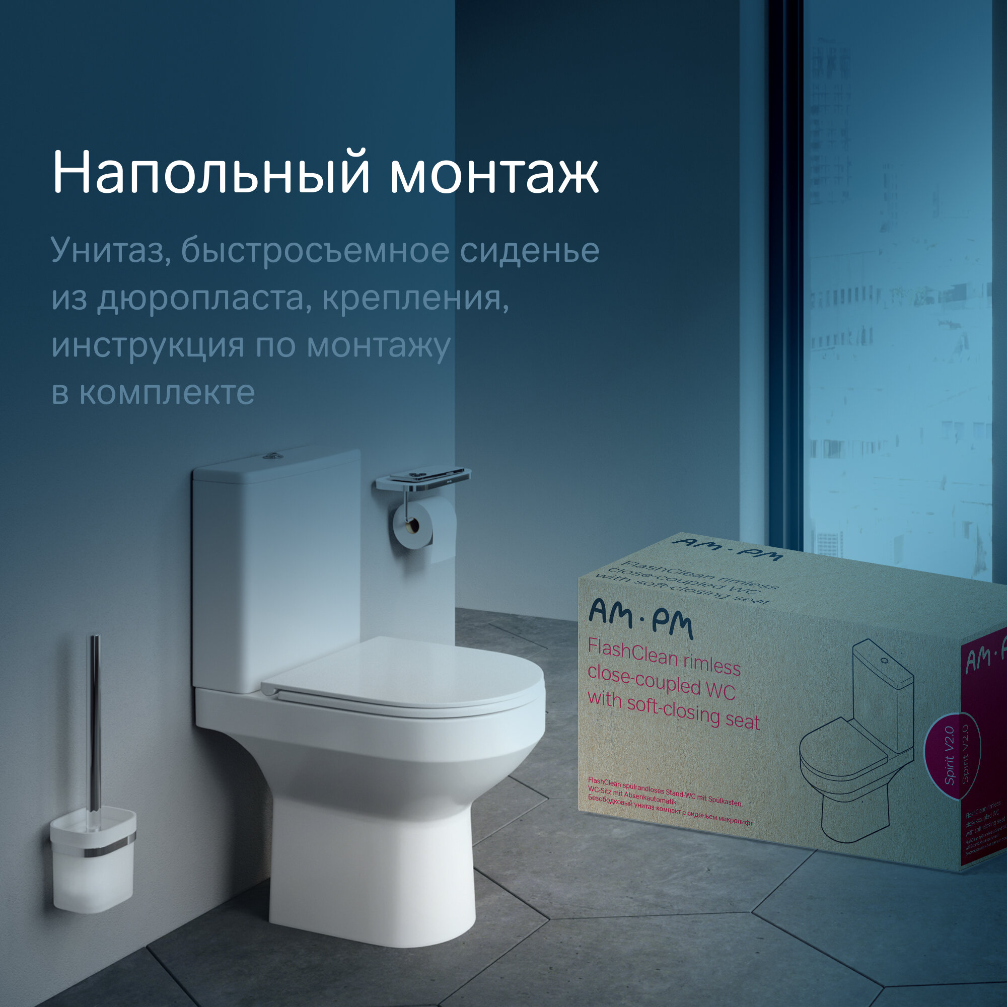 Унитаз напольный компакт AM.PM Spirit V2.0, белый, безободковый, с быстросъемным сиденьем микролифт, премиальный фарфор