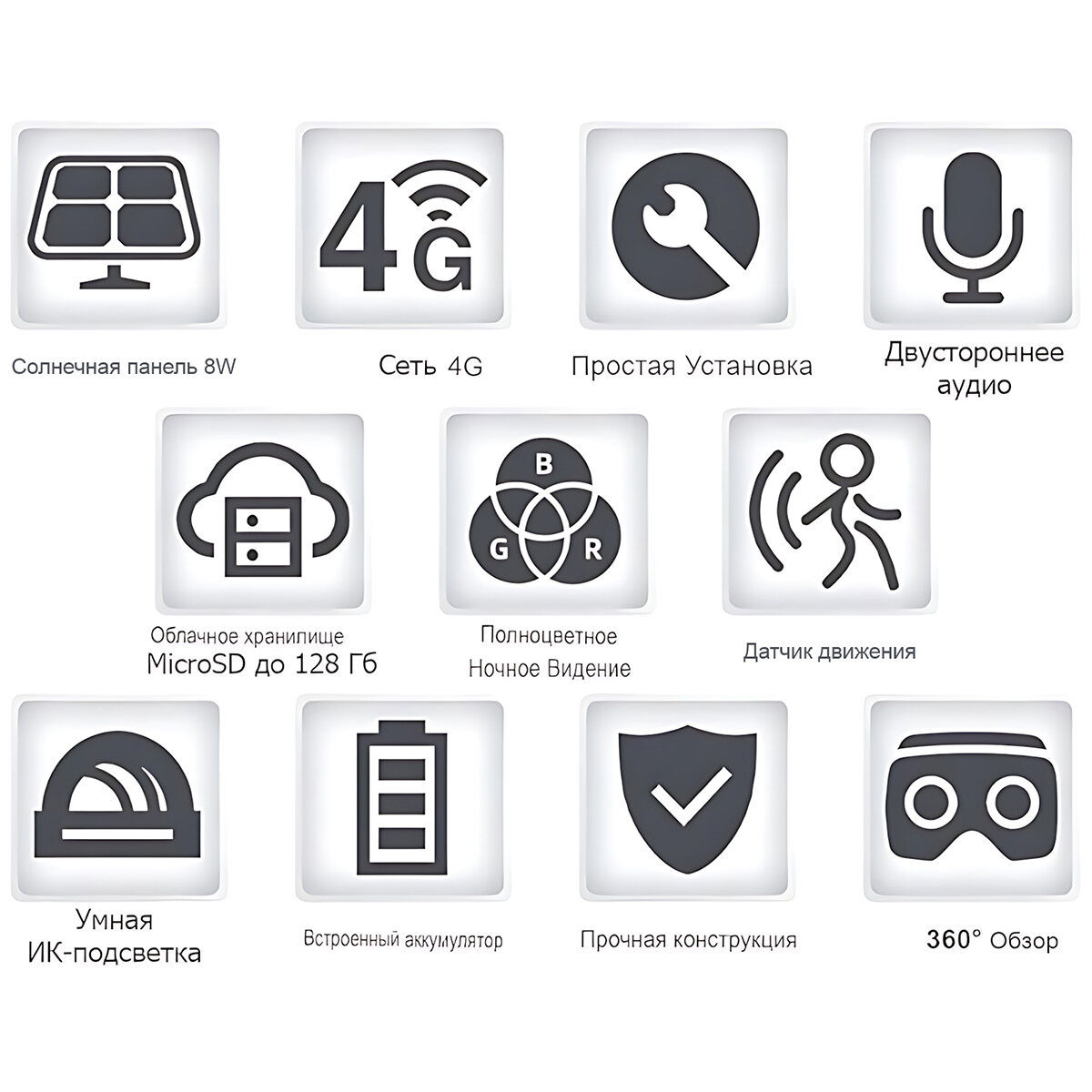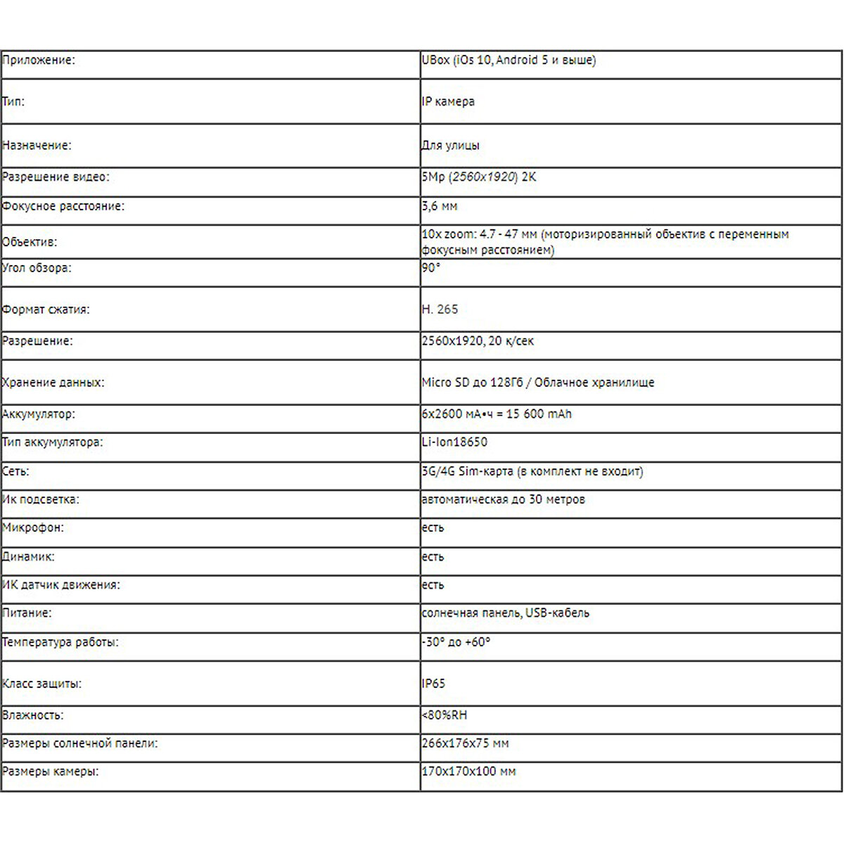 | Дополнительная информация | Комплектация: Видеокамера с кронштейном; Солнечна панель; Аккумулятор; Комплект крепежа; Кабель; Документация; Упаковка. |