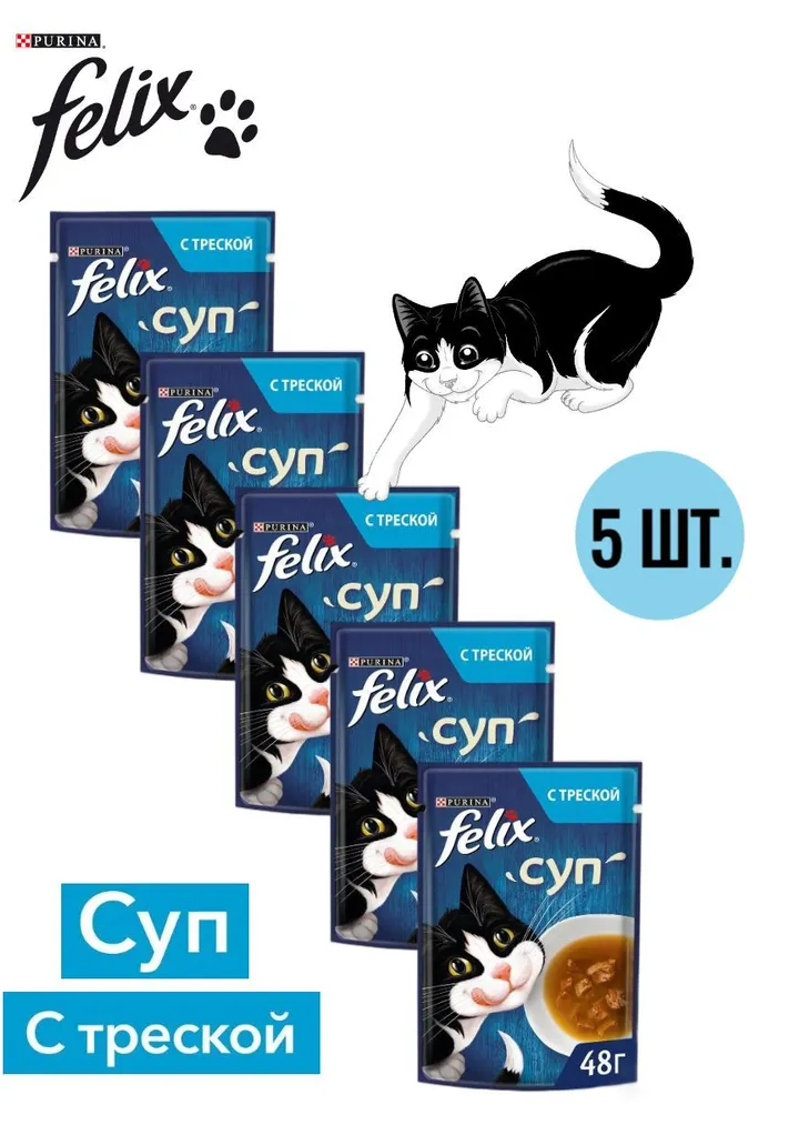 Купить Феликс влажный корм Felix Суп для любых взрослых кошек с треской 48г, 5 штук