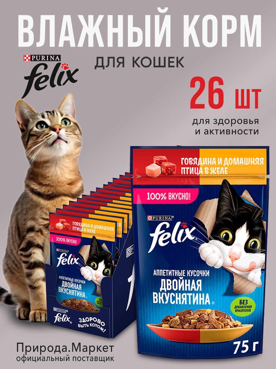 Felix 75 г пауч влажный корм для кошек аппетитные кусочки в желе двойная вкуснятина с говядиной и домашней птицей х26 штук