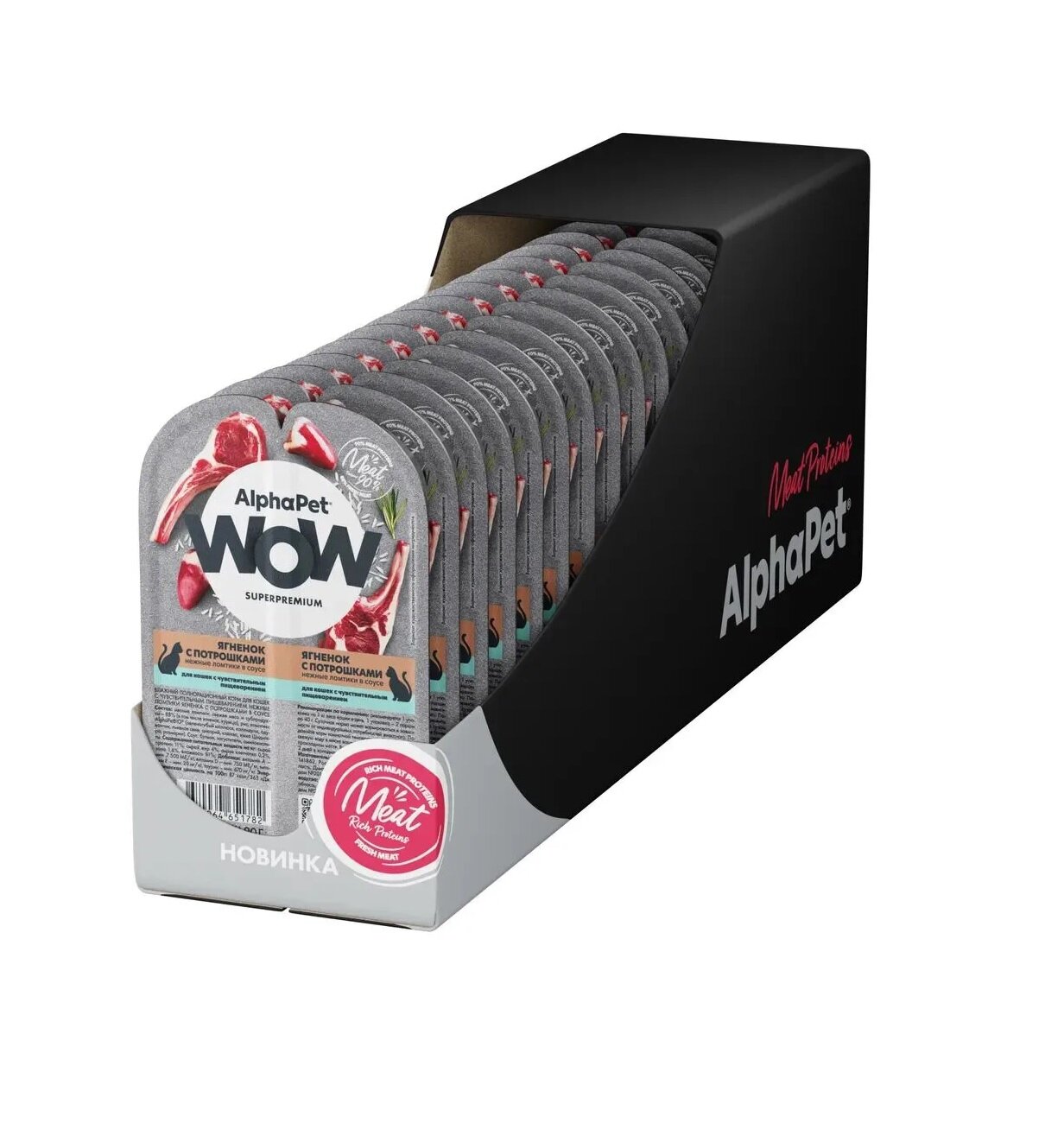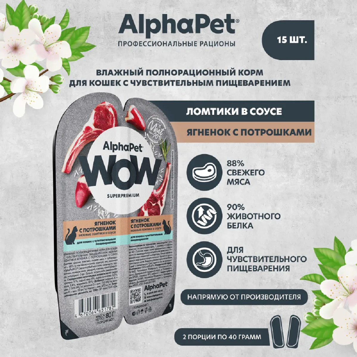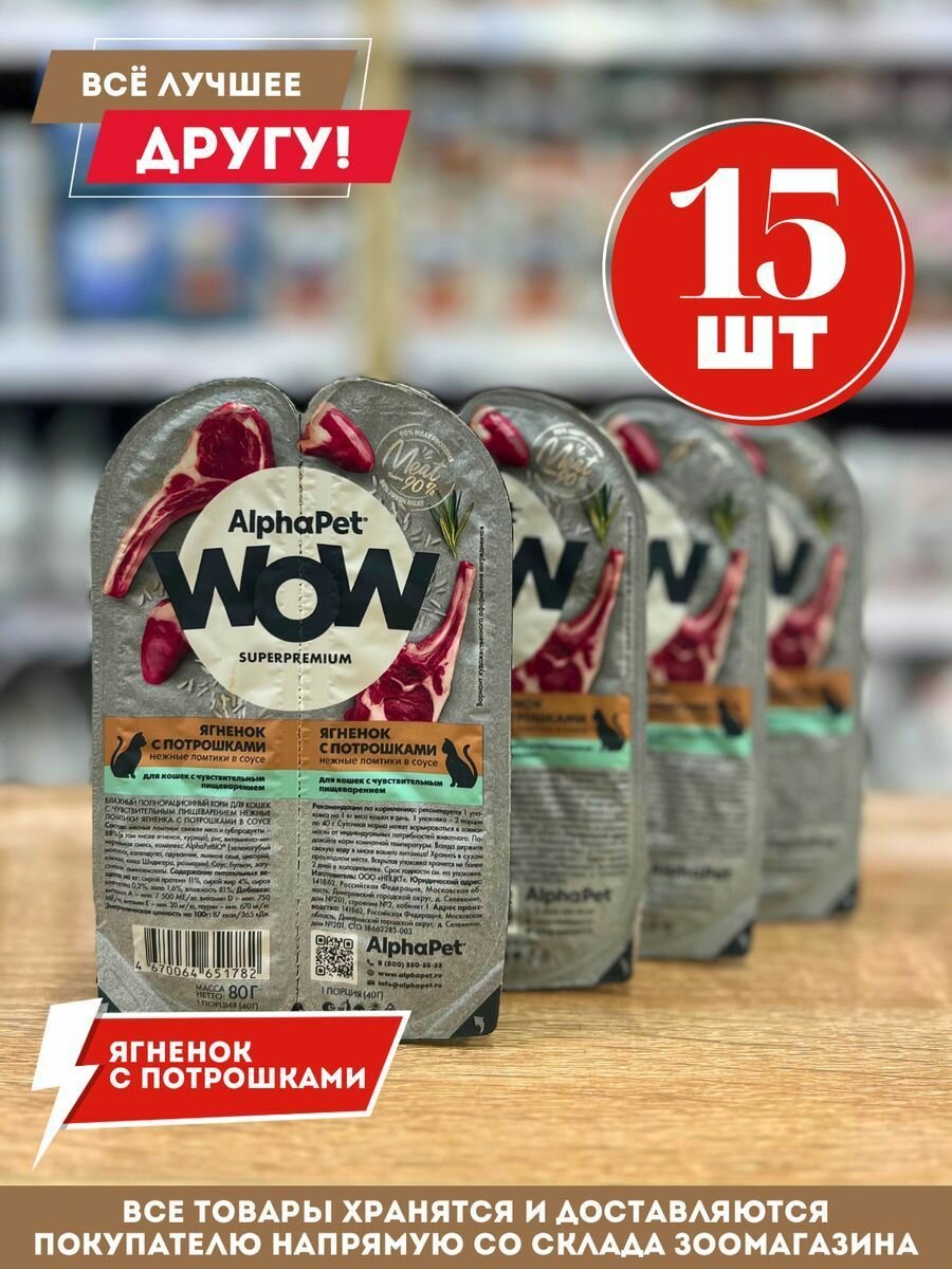 Купить Влажный корм для кошек AlphaPet WOW ягненок c потрошками в соусе, упаковка 15 шт х 80 гр