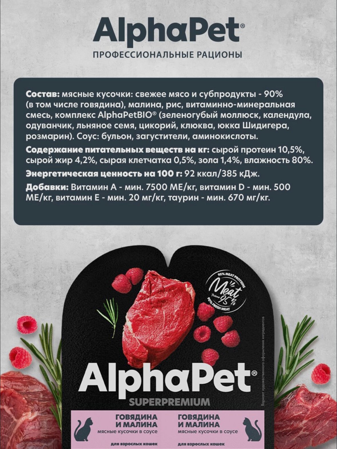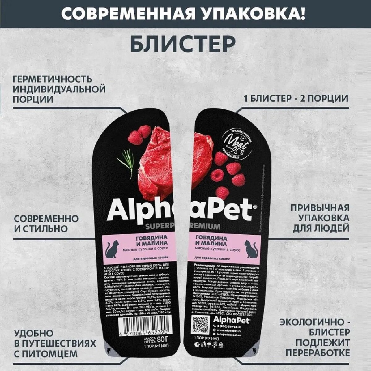 Купить AlphaPet Superpremium влажный корм для взрослых кошек мясные кусочки в соусе, говядина и малина, 80г х 15шт.