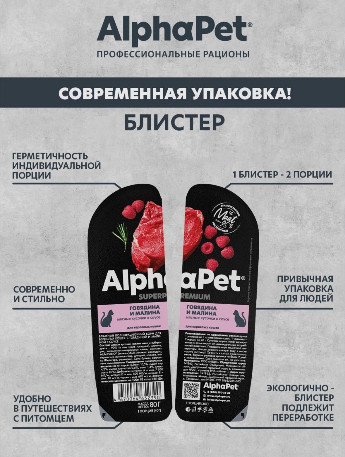 Влажный полнорационный корм AlphaPet Superpremium для кошек с говядиной и малиной в соусе 80г