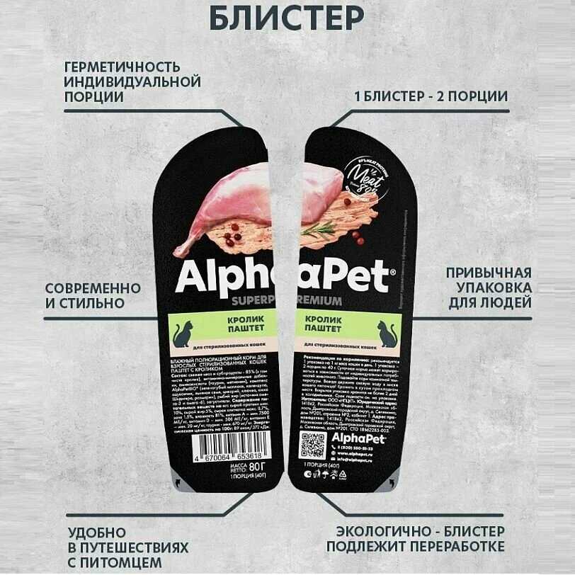 Купить AlphaPet Superpremium Влажный полнорационный корм для взрослых стерилизованных кошек паштет с кроликом(новинка) 80*15 шт