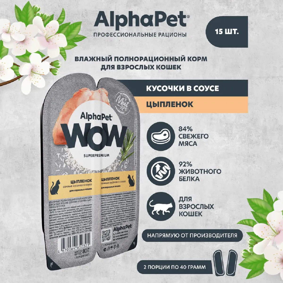 Влажный полнорационный корм для взрослых кошек AlphaPet WOW Superpremium, Цыпленок сочные кусочки в соусе, 80г * 15 шт