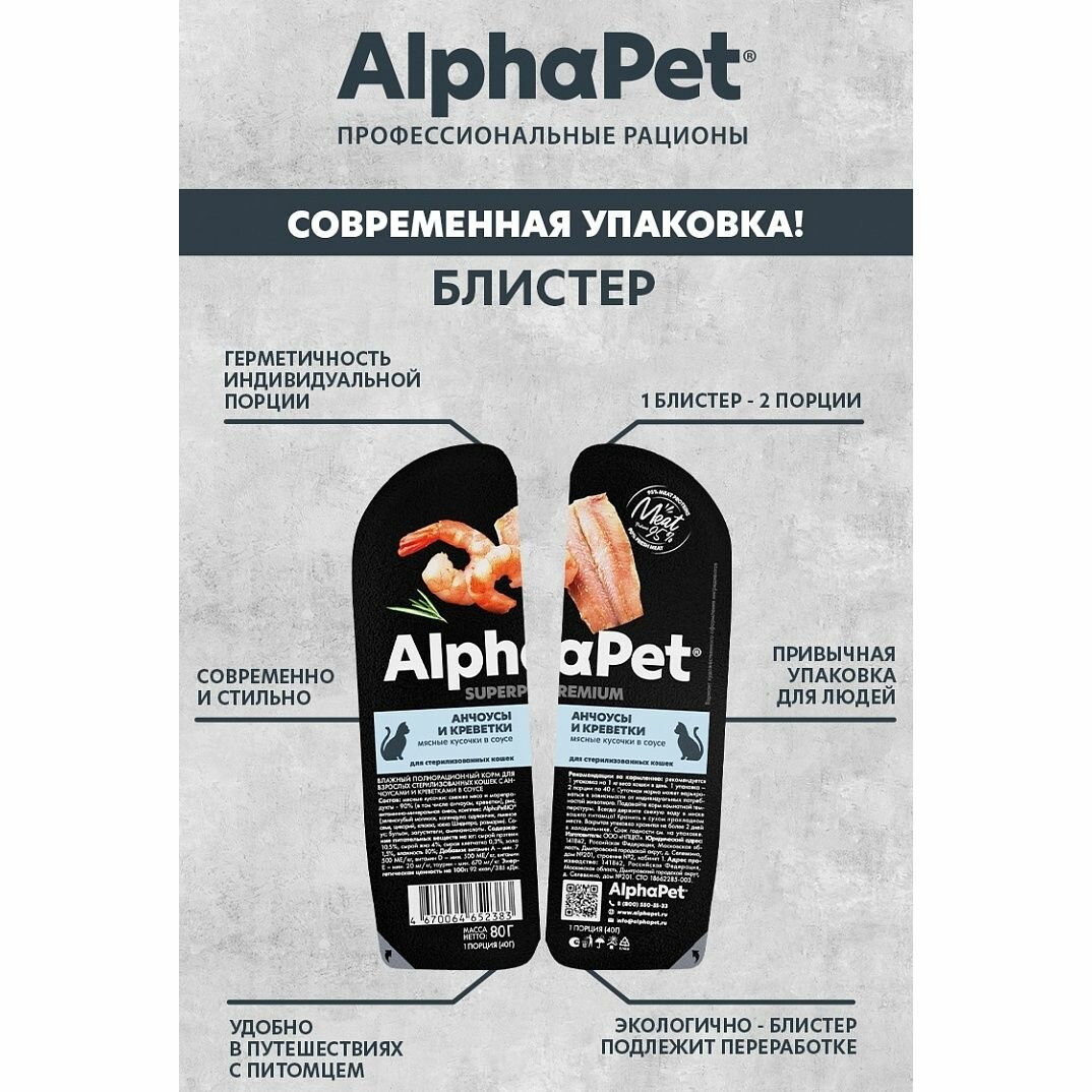 Влажный полнорационный корм холистик для взрослых стерилизованных кошек AlphaPet Superpremium Анчоусы и креветки мясные кусочки в соусе 80 гр х 15 шт