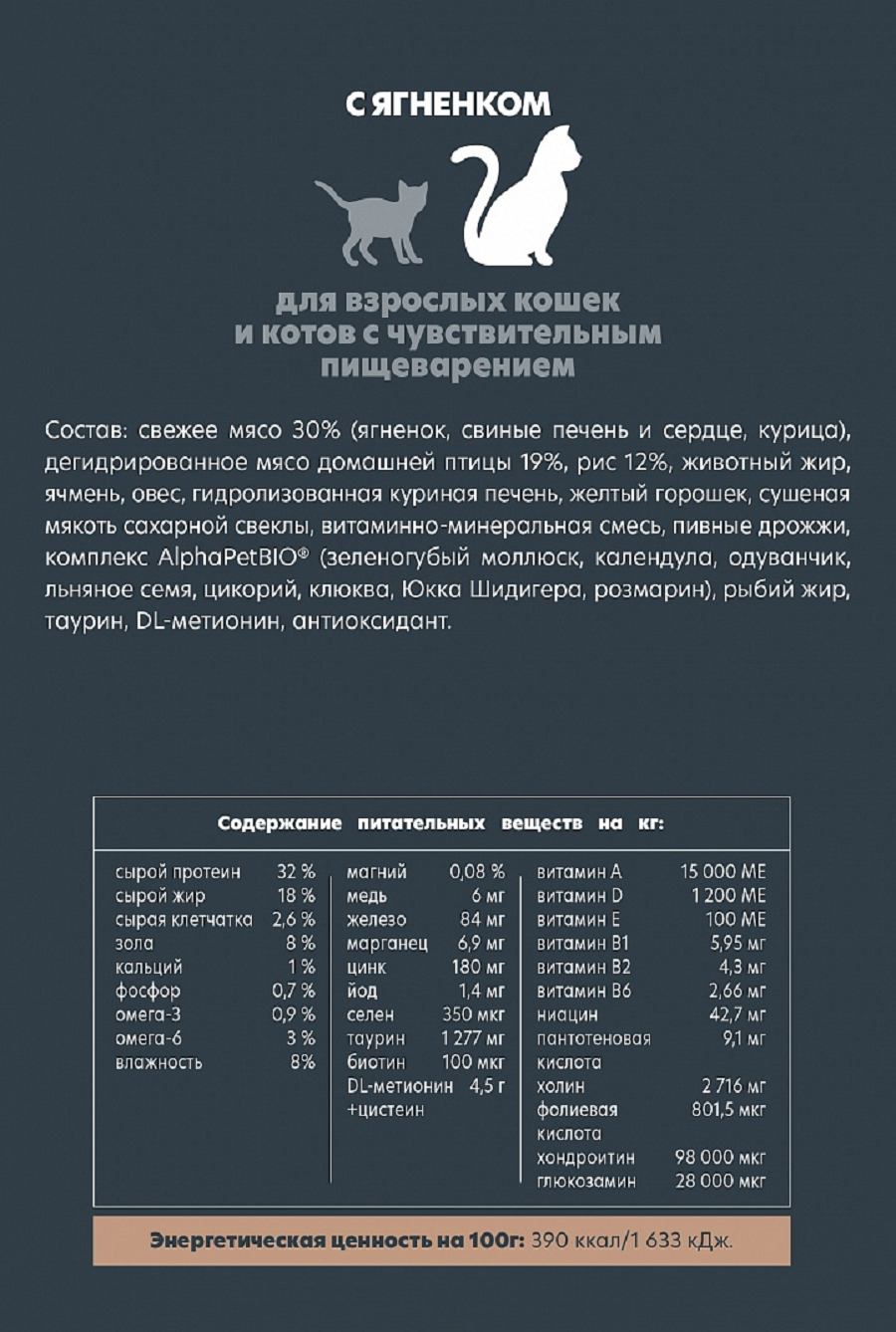| Состав | свежее мясо 30% (ягненок, индейка, курица), дегидрированное мясо домашней птицы 19%, рис 15%, ячмень, овес, гидролизованная куриная печень, животный жир, желтый горошек, витаминно-минеральная смесь, сушеная мякоть сахарной свеклы, пивные дрожжи, комплекс AlphaPetBIO® (зеленогубый моллюск, календула, одуванчик, льняное семя, цикорий, клюква, Юкка Шидигера, розмарин), рыбий жир, таурин, DL- метионин, антиоксидант |