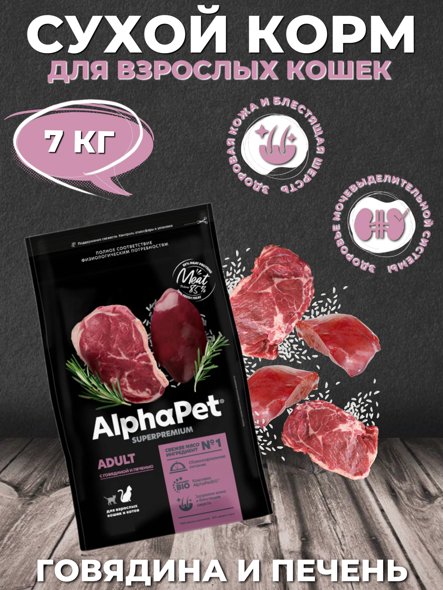 Сухой полнорационный корм AlphaPet Superpremium с говядиной и печенью для взрослых кошек и котов 7кг