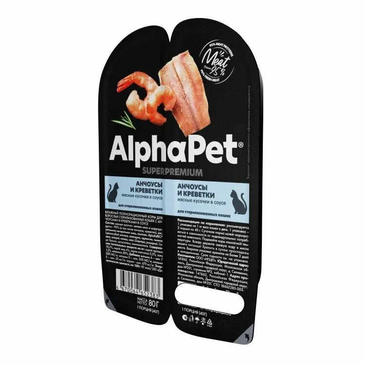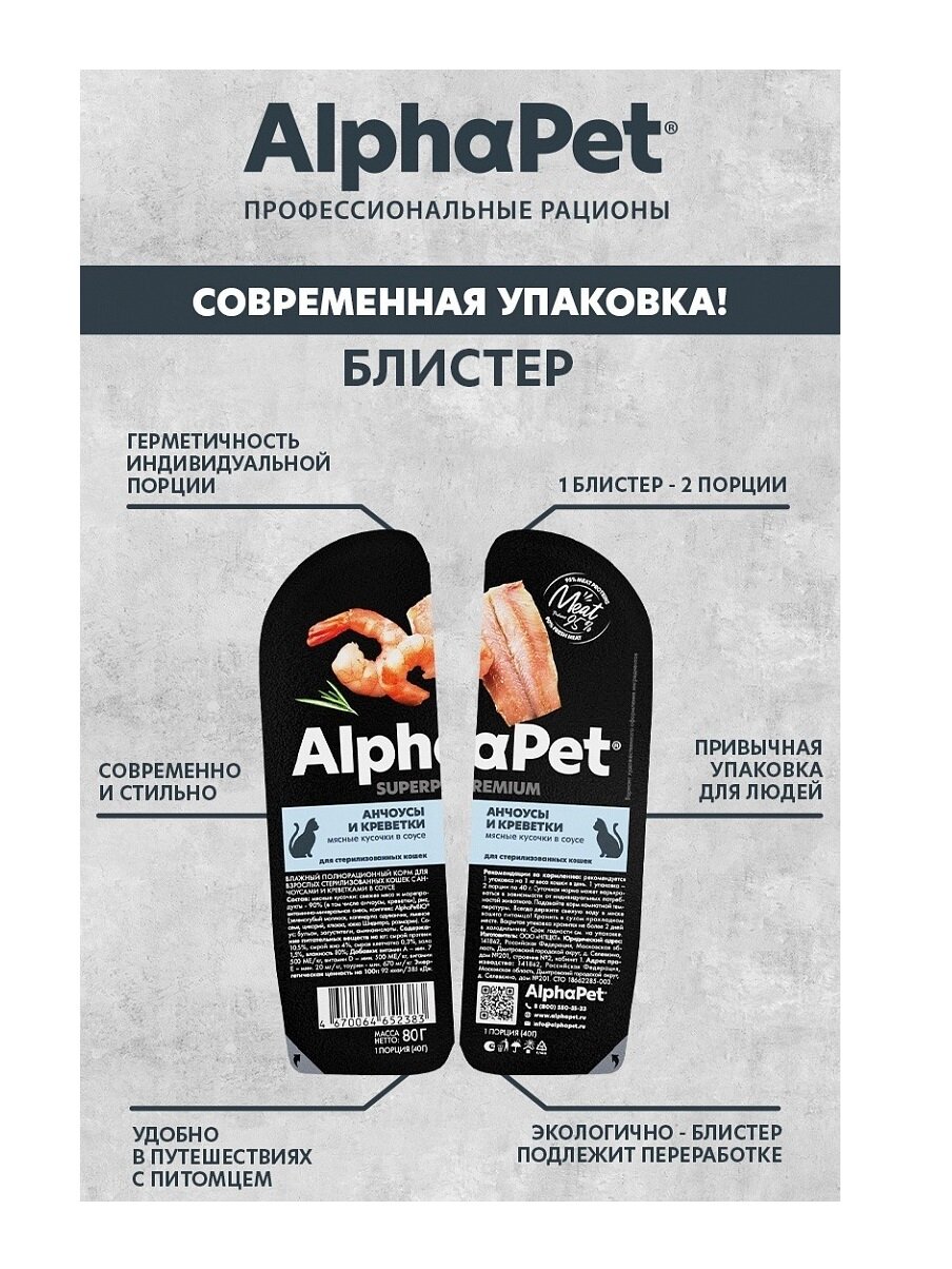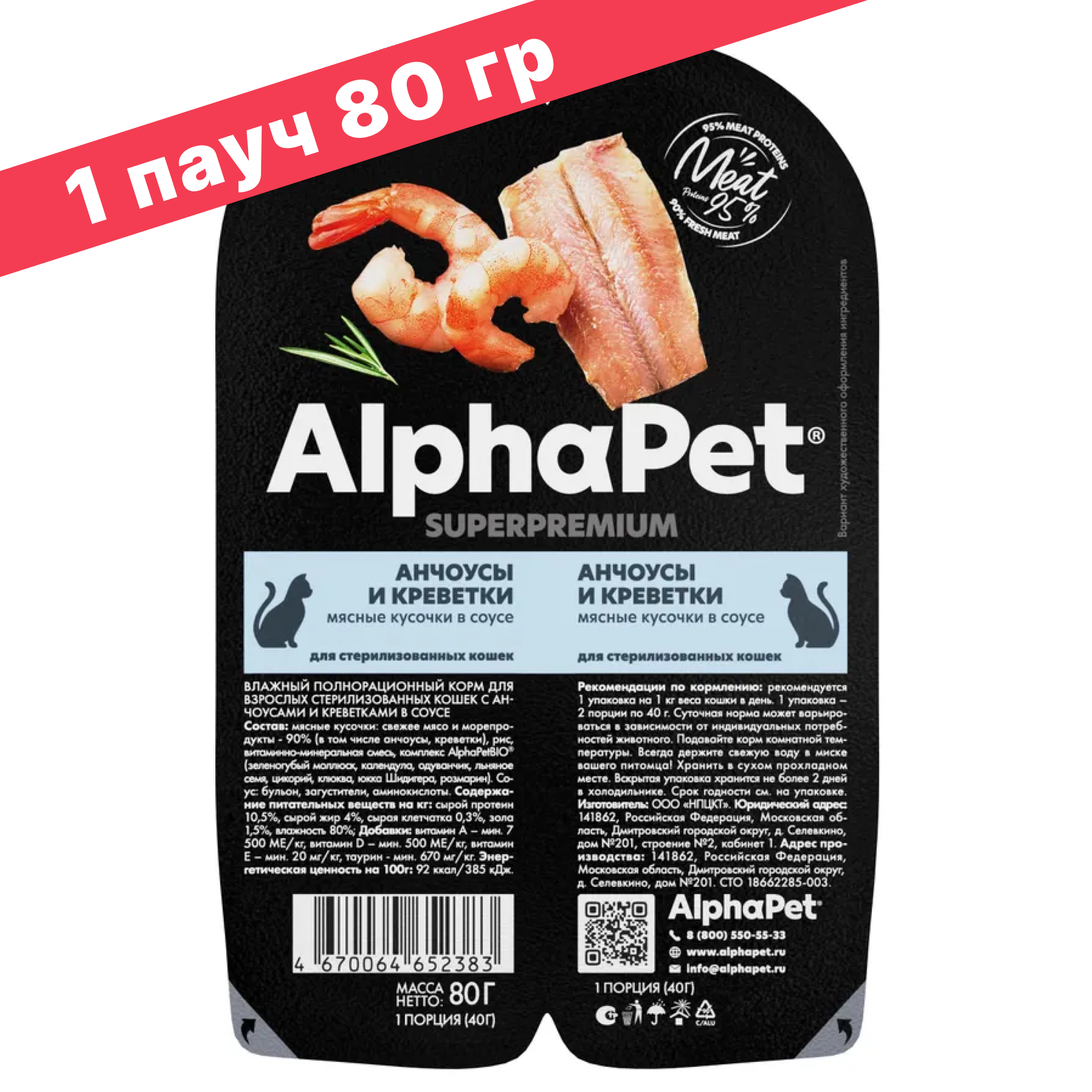 Купить AlphaPet Superpremium пауч для взрослых стерилизованных кошек мясные кусочки в соусе Анчоусы и креветки 80г