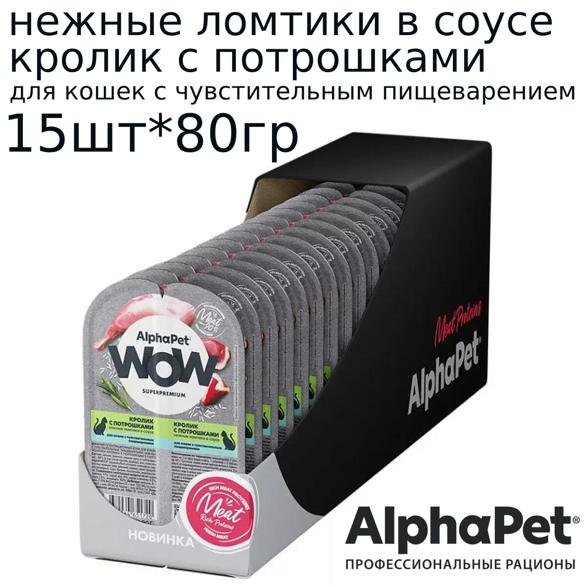 AlphaPet WOW 15шт по 80г корм для кошек c чувствительным пищеварением, кролик с потрошками сочные ломтики в соусе