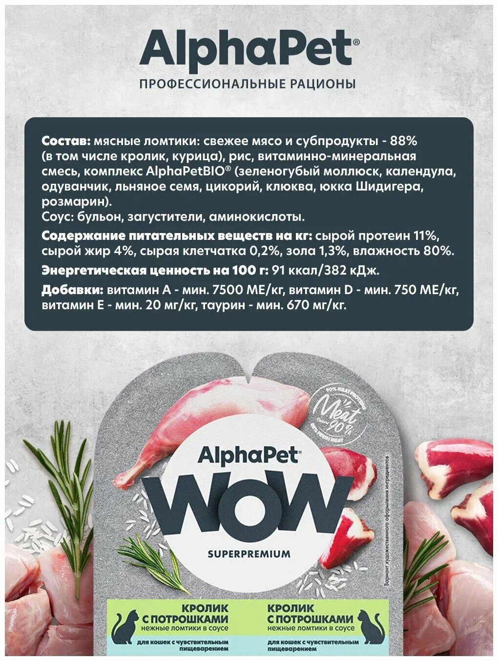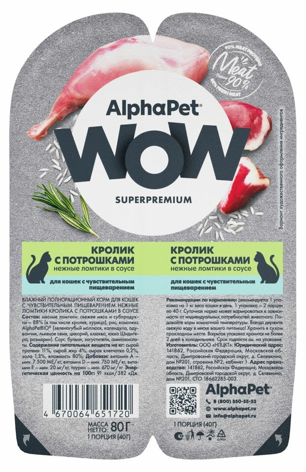 Купить AlphaPet WOW Superpremium влажный корм для кошек с чувствительным пищеварением кролик с потрошками в соусе, в ламистерах - 80 г