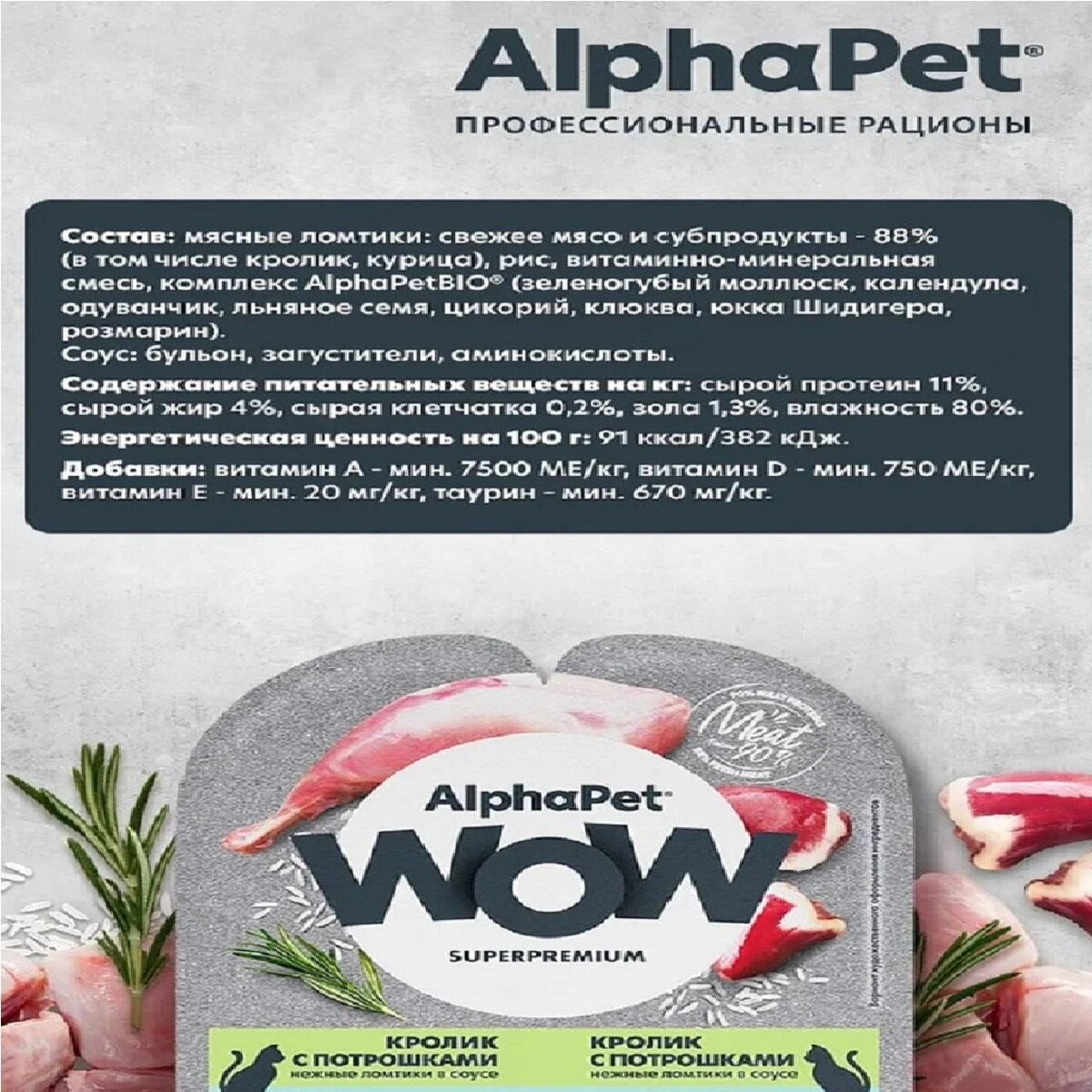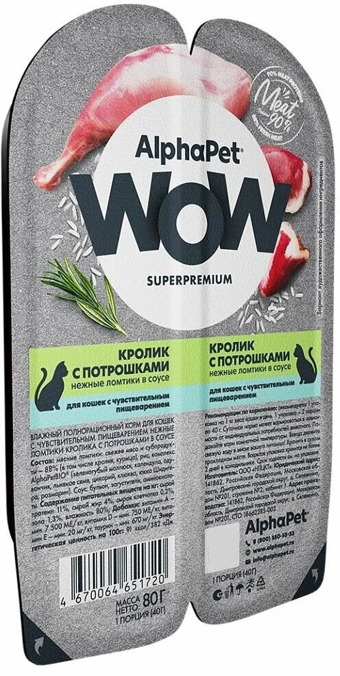 AlphaPet WOW 15шт по 80г корм для кошек c чувствительным пищеварением, кролик с потрошками сочные ломтики в соусе