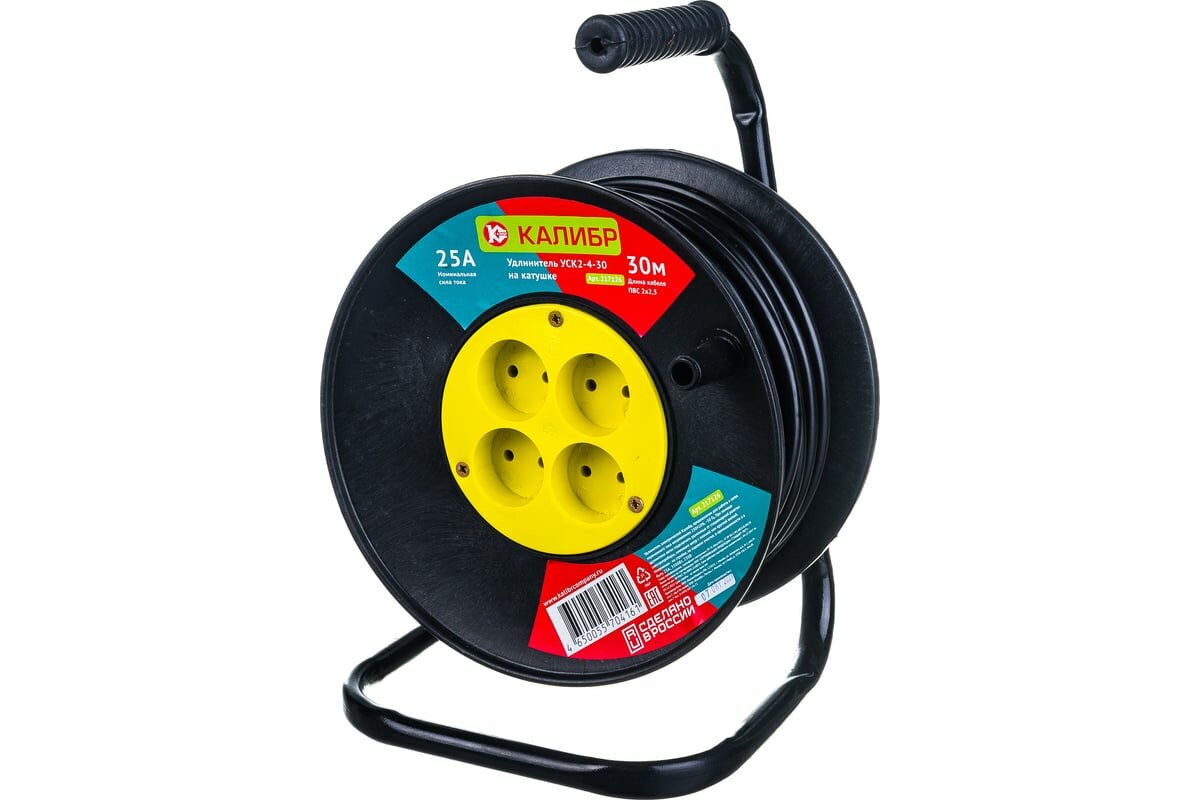 Удлинитель силовой Калибр УСК2-4-30, розеток 4шт, 2x2.5 кв.мм, 20A, 30м, ПВС, катушка, черный [217126]