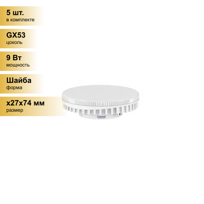 (5 шт.) Светодиодная лампочка General GX53 9W 2700K 2K 75x26.5 рифл. пластик 642700 . Цоколь GX53