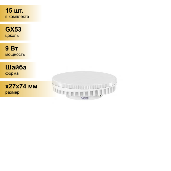 (15 шт.) Светодиодная лампочка General GX53 9W 2700K 2K 75x26.5 рифл. пластик 642700 Теплый белый. Цоколь GX53