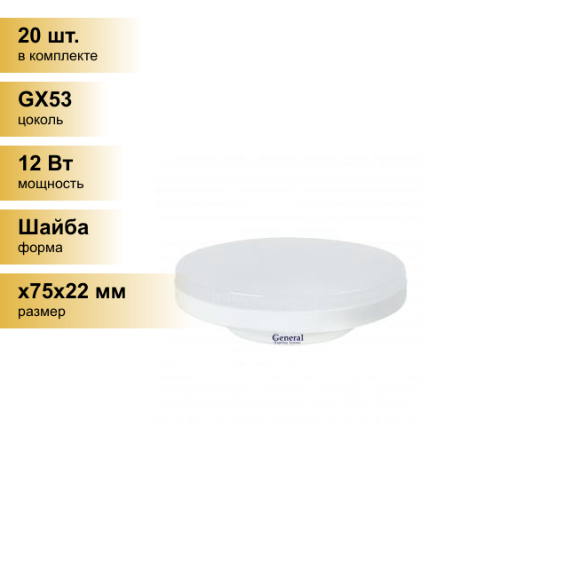 (20 шт.) Светодиодная лампочка General GX53 св/д 12W 2700K 2K 75x22 рифл. стекло пластик 685100 Теплый белый. Цоколь GX53
