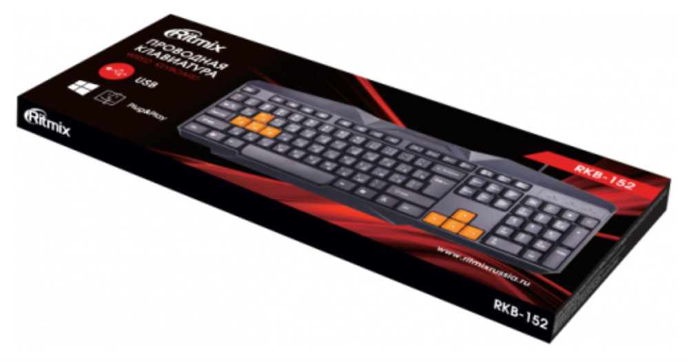 Клавиатура RITMIX RKB-152, черная/оранжевая, USB. Кол-во клавиш: 104. Длина кабеля 135 см. (1/20)