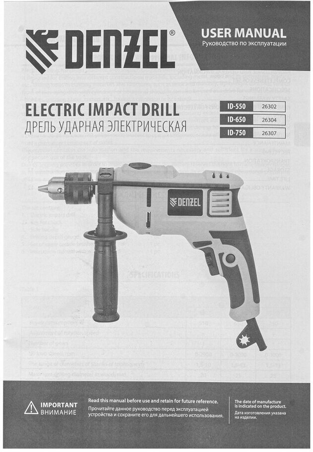 Дрель ударная Denzel ID-650, 650 Вт, 0-3000 об/мин, 48000 уд/мин 26304