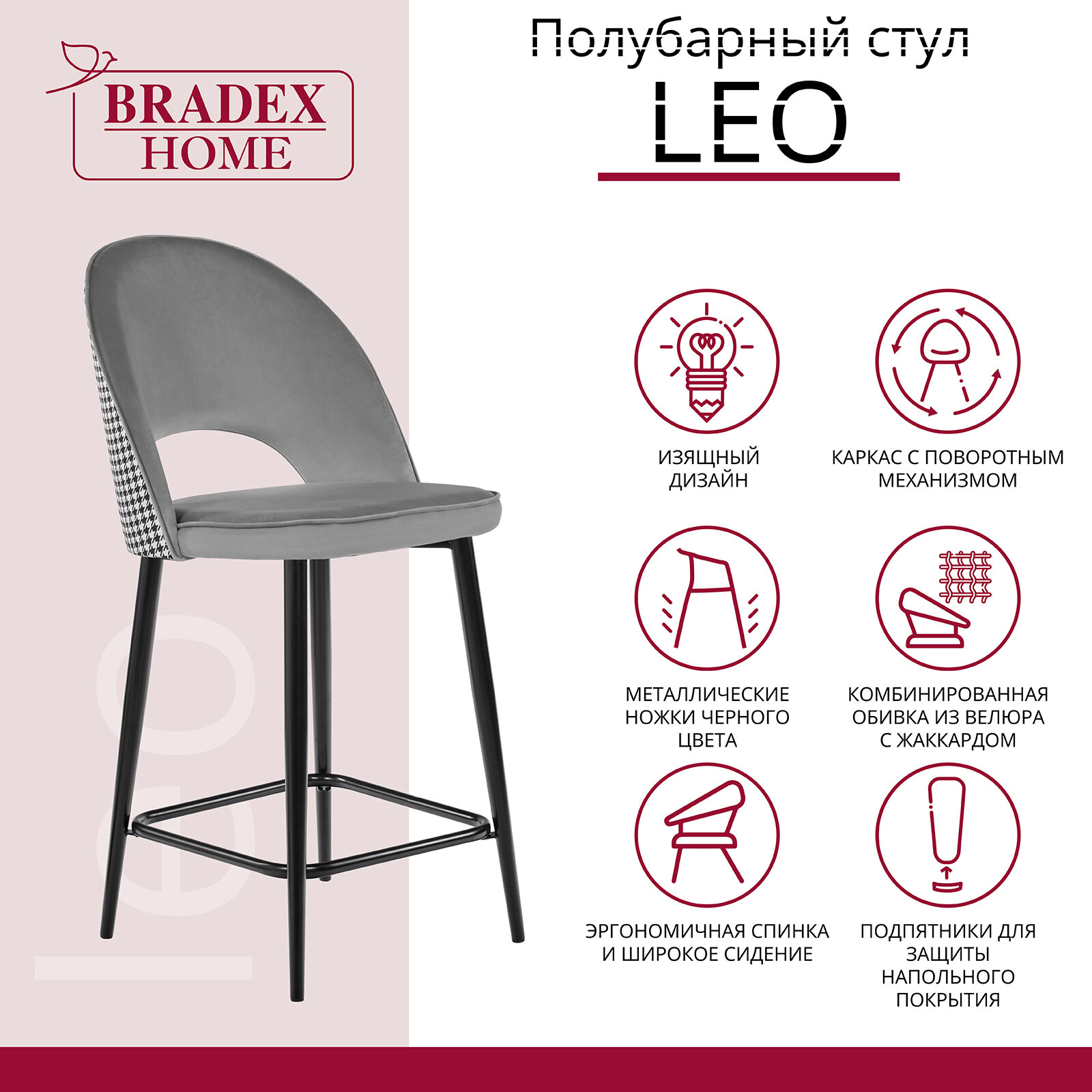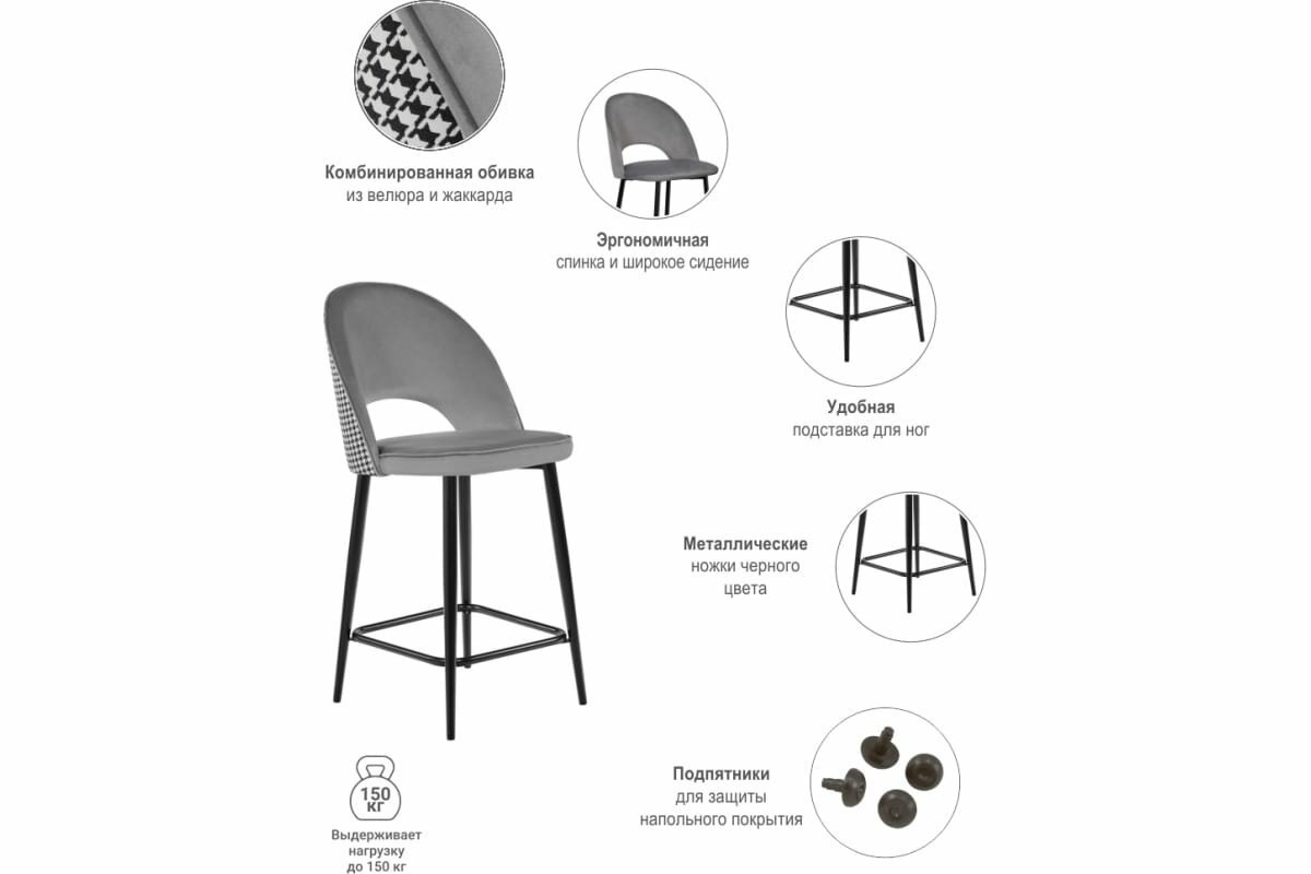Купить Стул полубарный с поворотным механизмом Leo темно-серый велюр с жаккардом / Стулья мягкие со спинкой для дома дачи/ Стулья барные для кухни на балкон