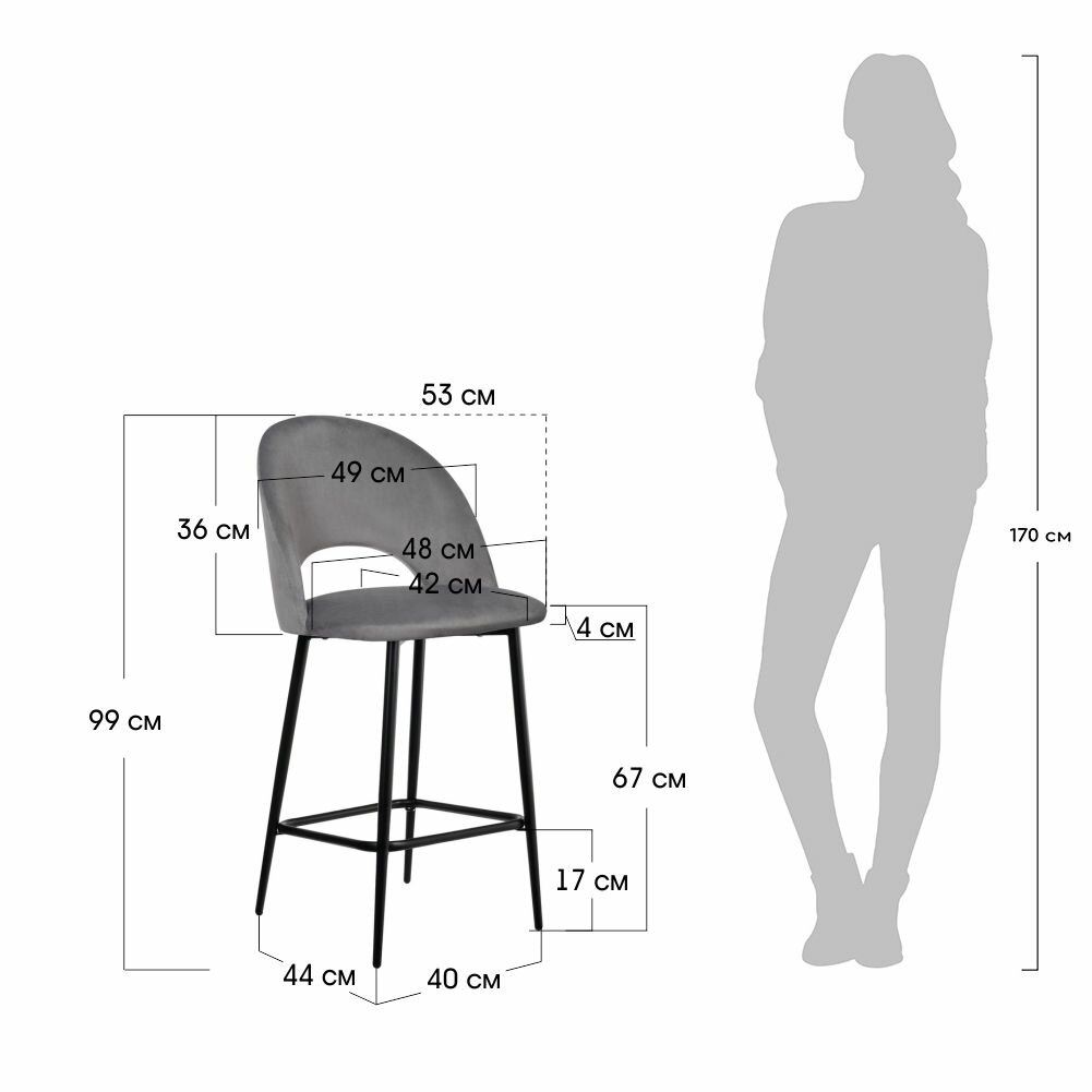Стул полубарный Leo STOOL MARKET черный, серый, металл, велюр, мягкое сиденье, без подлокотников