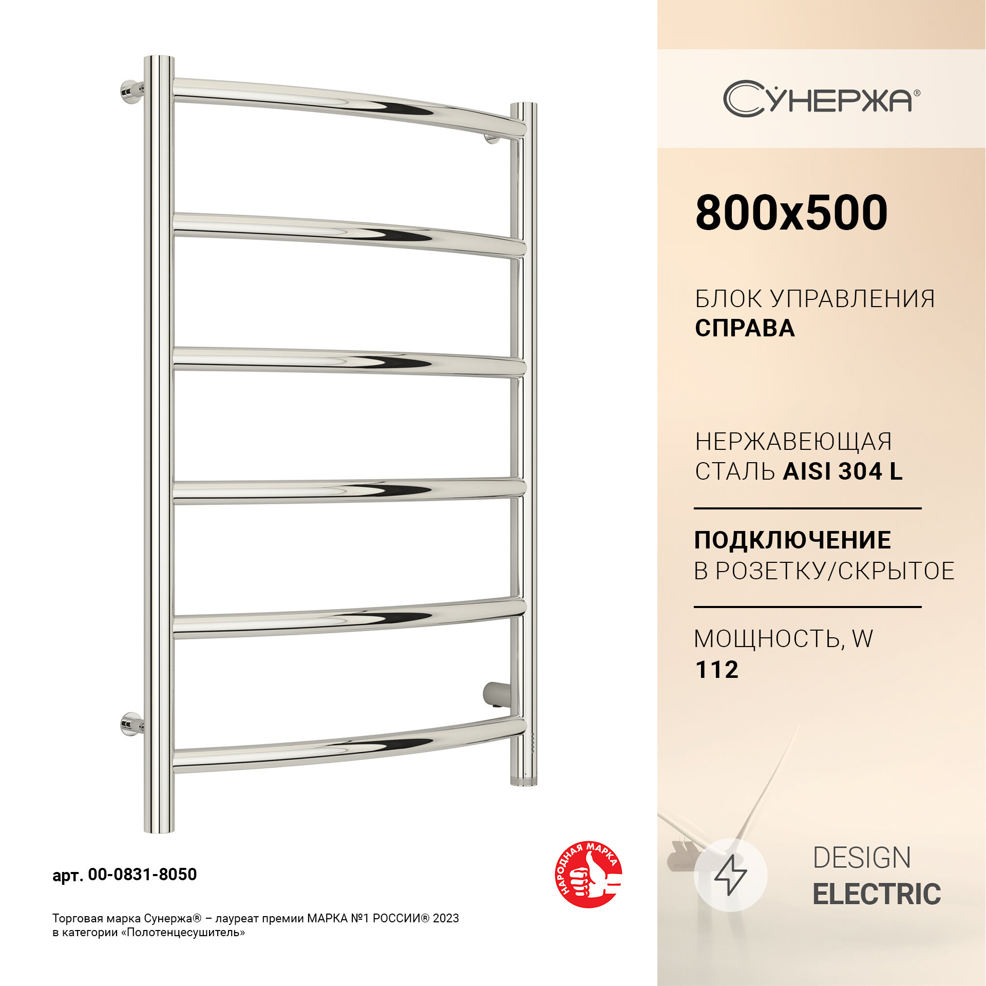 СУНЕРЖА Галант 4.0 Полотенцесушитель 800х500 нерж.сталь, правый 00-0831-8050
