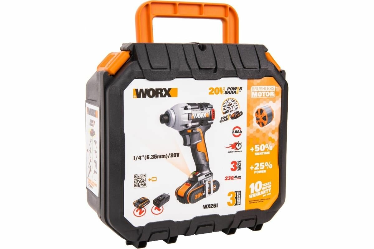 WORX Винтоверт ударный бесщеточный аккумуляторный WORX WX261, 20В, 2Ач х2, ЗУ, кейс