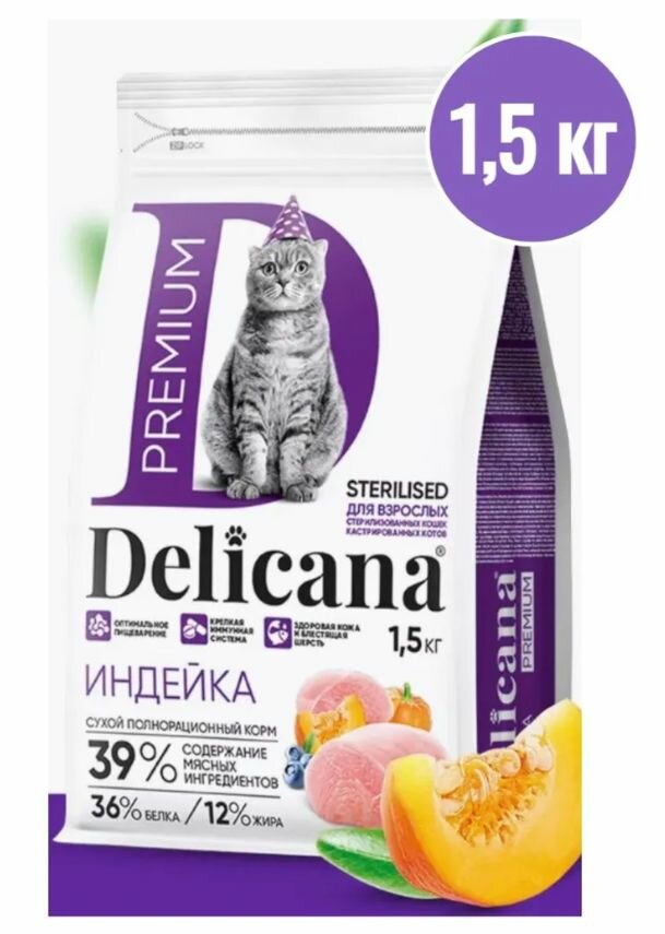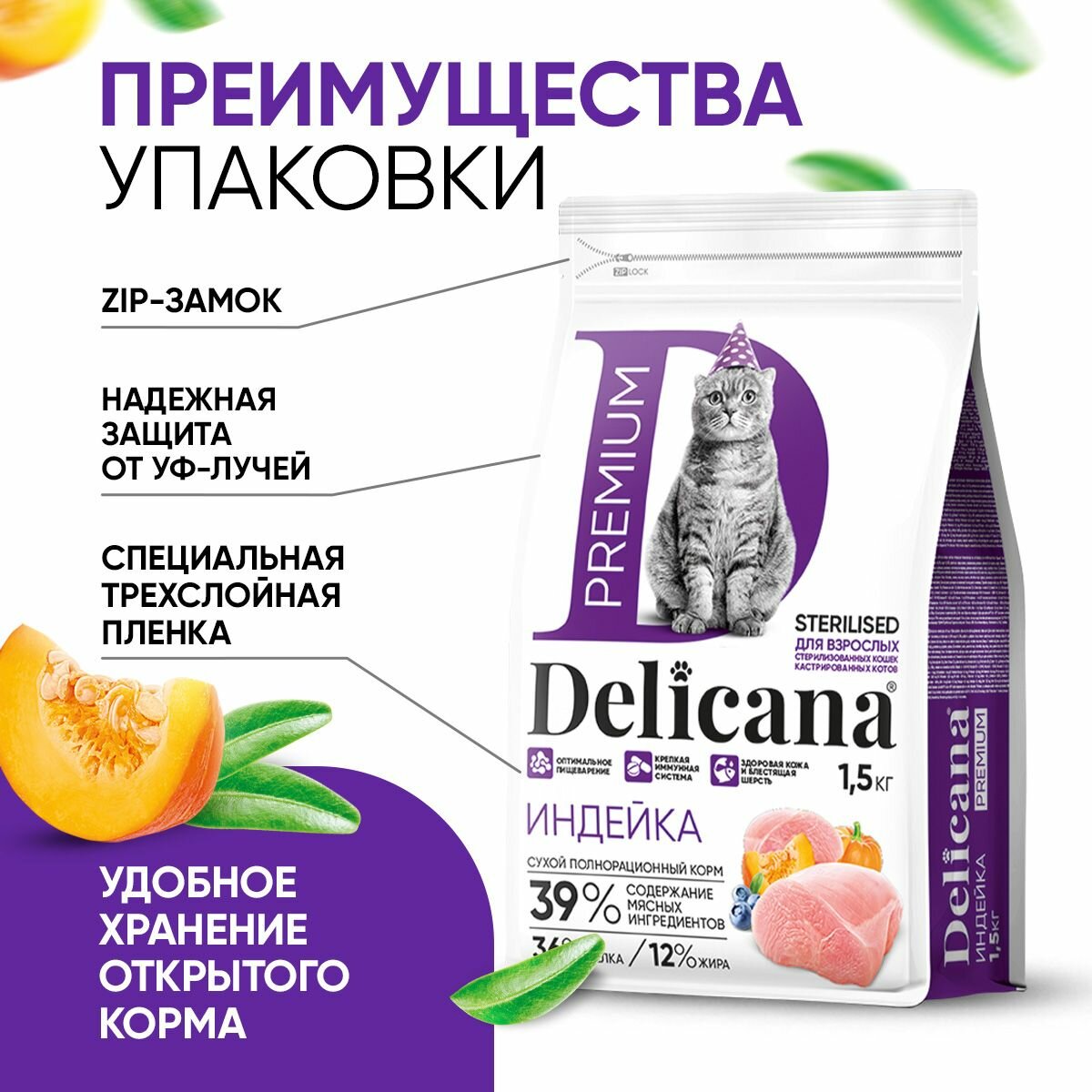 Корм сухой Delicana для стерилизованных кошек / кастрированных котов Индейка 1,5 кг