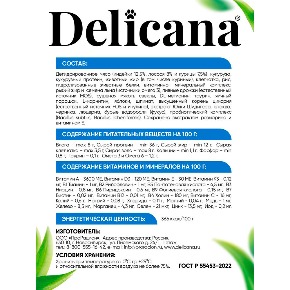 Корм сухой Delicana для стерилизованных кошек / кастрированных котов Индейка 1,5 кг