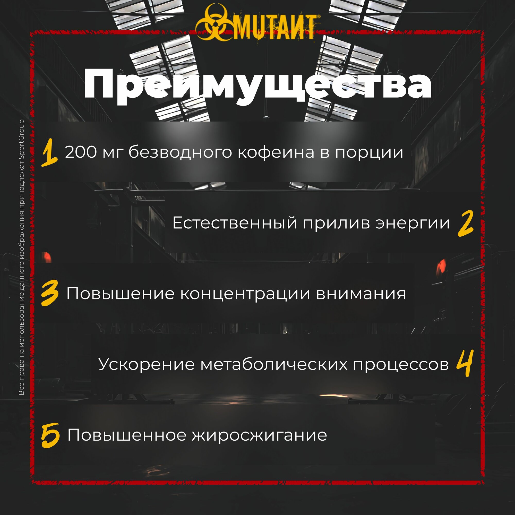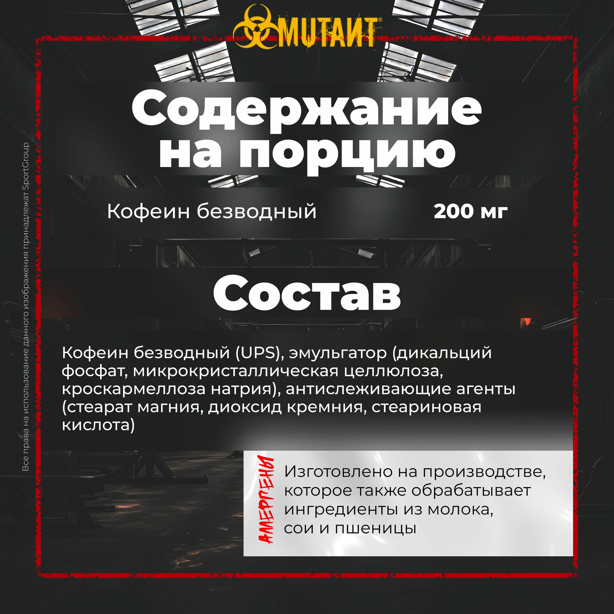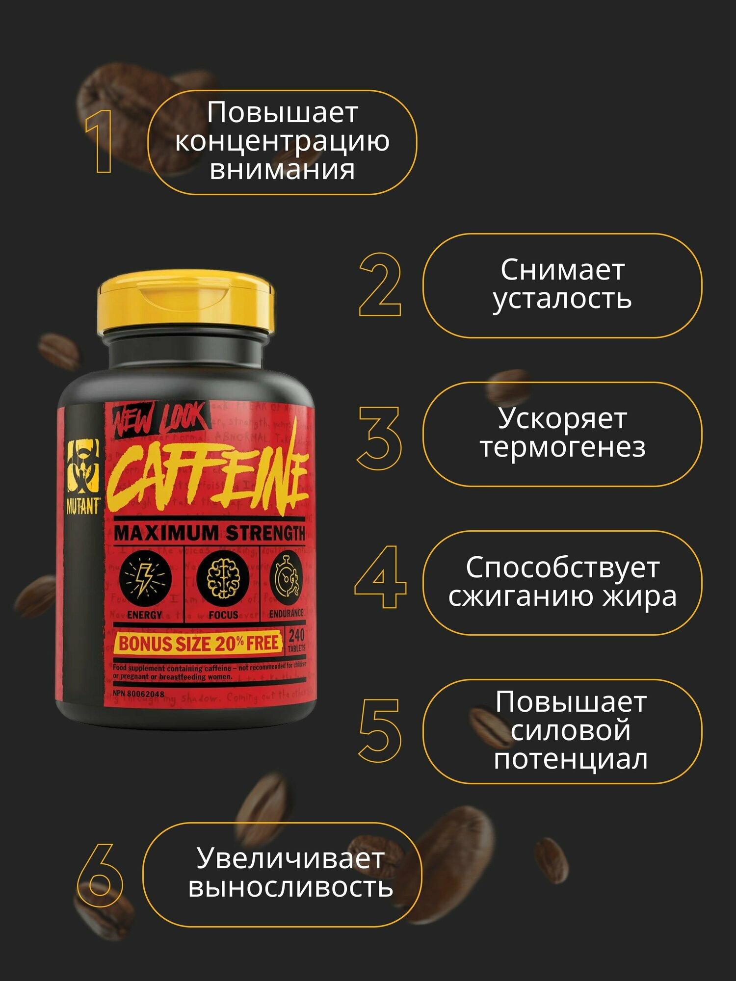 Долго выбирал спортивную фирму для приобретения кофеина - остановился на Mutant. Прекрасный препарат, одной таблетки хватает на половину дня и иногда даже больше по времени. По началу чувствуется как тебя "выключает" от кофеина, но со временем уже перестаешь замечать это. Употребляю почти каждый день (строго перед тренировкой), также использовал после бессонной ночи перед экзаменом. Со своими функциями справляется хорошо, но советую употреблять данный препарат только "под задачи". По поводу действия кофеина - давал таблетку разным людям, на многих действует как и на меня, некоторым вообще не хватает одной таблетки - все строго индивидуально, поэтому если на вас не действует, значит у вас повышенная толерантность к кофеину.