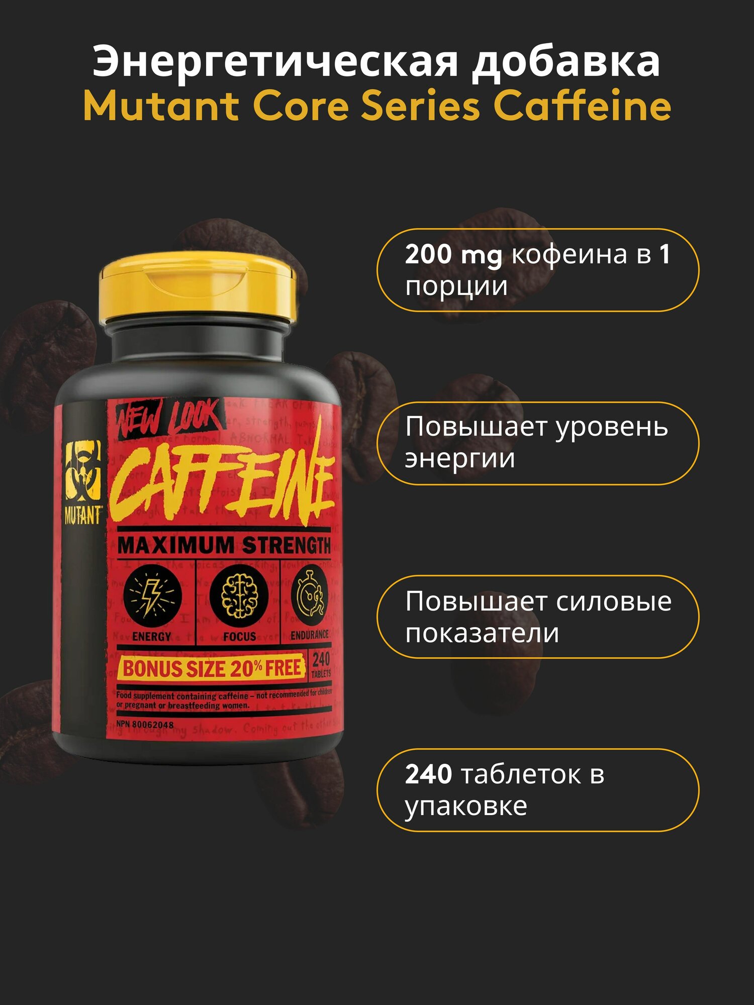 Ниже Вы можете прочитать отзывы на Энергетическая добавка Mutant Core Series Caffeine / энергетик спортивный, кофеин, 240 таблеток (240 порций), ознакомится с подробными характеристиками, посмотреть интересные обзоры и фотографии на Энергетическая добавка Mutant Core Series Caffeine / энергетик спортивный, кофеин, 240 таблеток (240 порций).