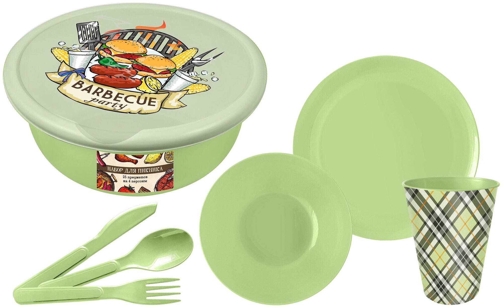 Набор для пикника с декором, 25 предметов на 4 персоны, (салатовый)
