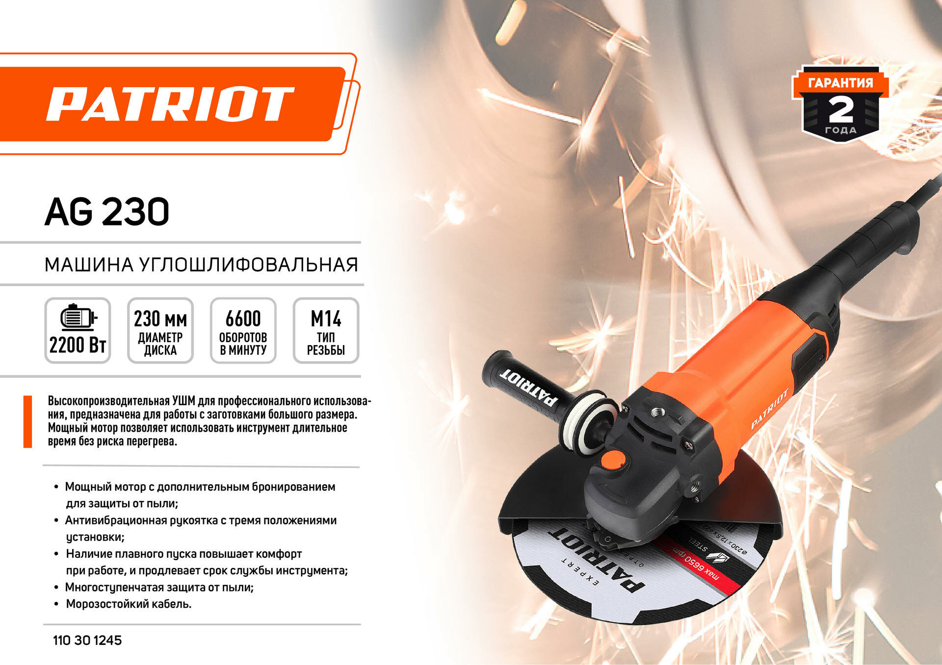 СохранитьМашина углошлифовальная (УШМ) PATRIOT AG 230 интересное: