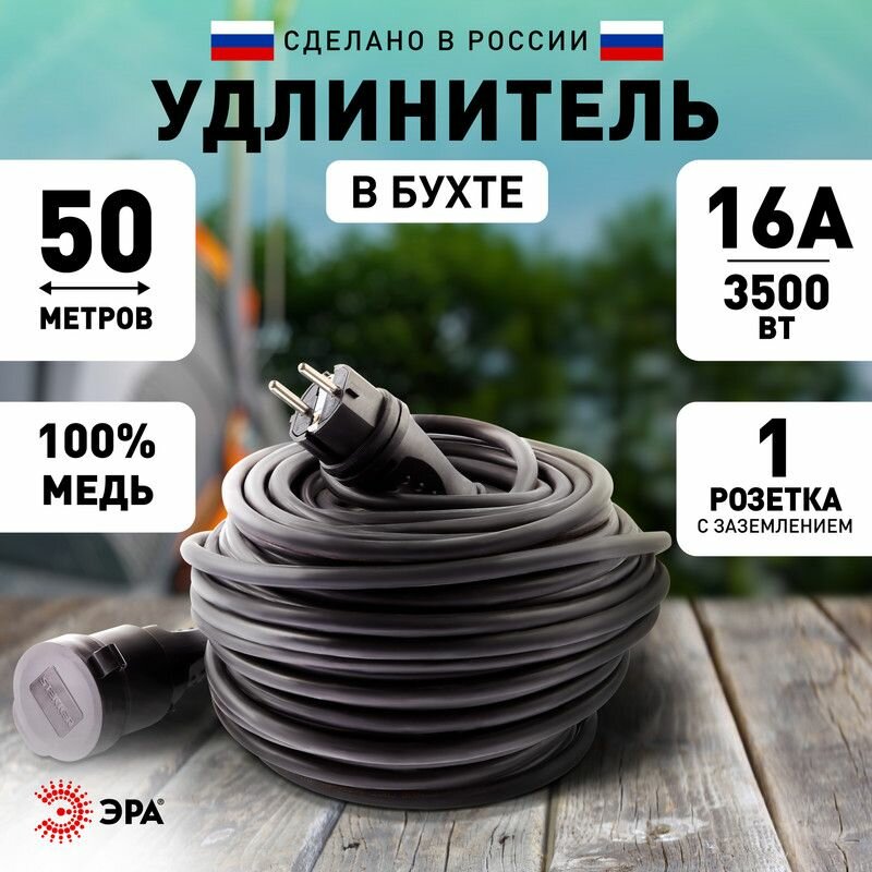 Купить Удлинитель-шнур ЭРА Б0050861, 1 розетка, с/з, 16А / 3500 Вт 1 50 м 1.5 м² 260 мм 280 мм 120 мм черный