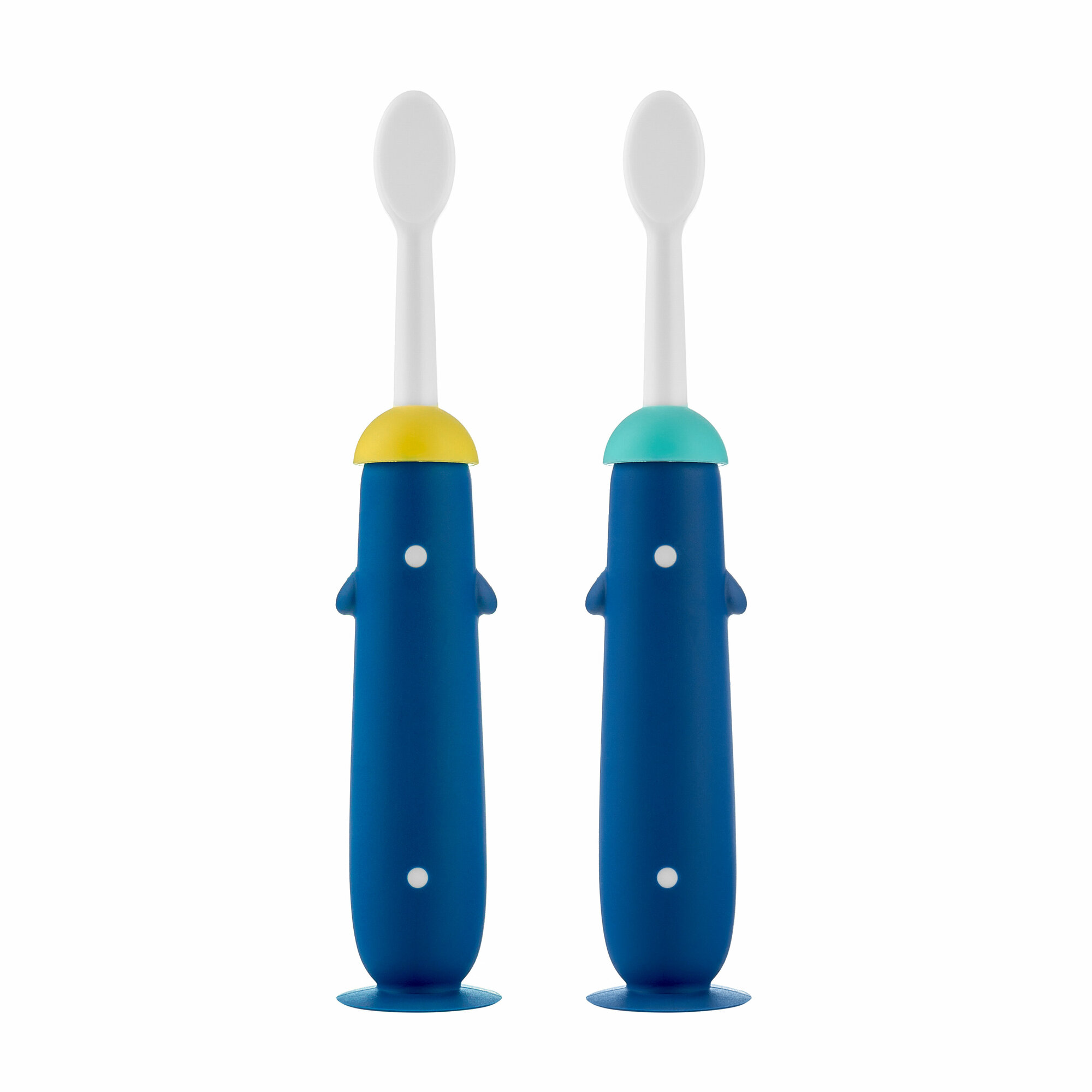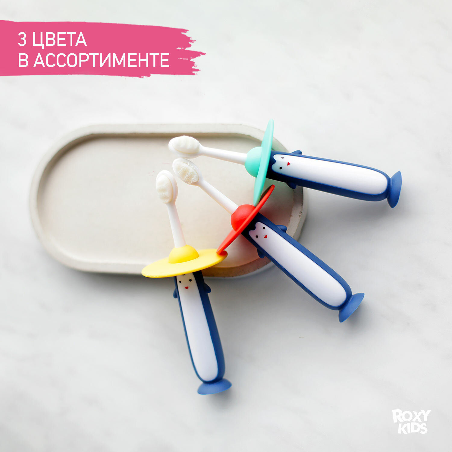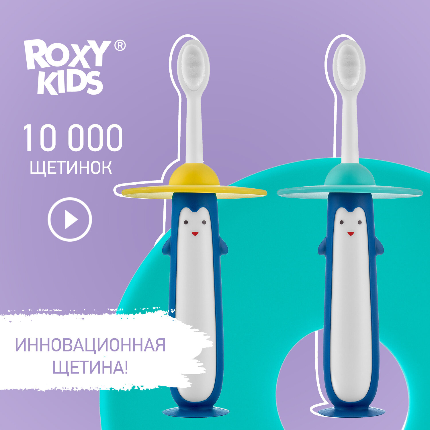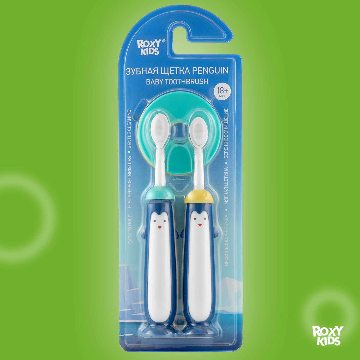 Детская зубная щетка "Пингвин"от ROXY KIDS, монопучковая, ультрамягкая, на присоске, 2шт, цвет голубой +желтый