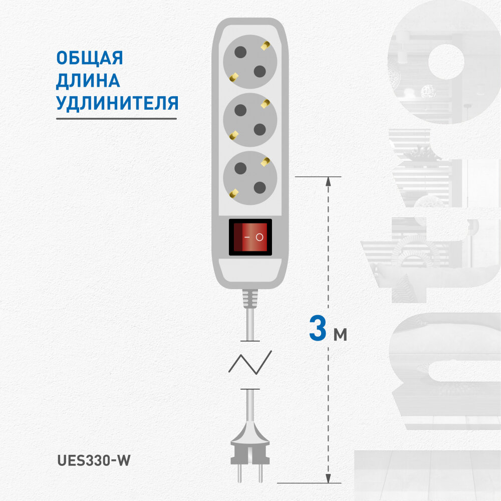 Удлинитель Intro UES330-W сетевой электрический бытовой с заземлением с выключателем 3 розетки, 3 м, ПВС 3х0,75мм2, 10А, белый